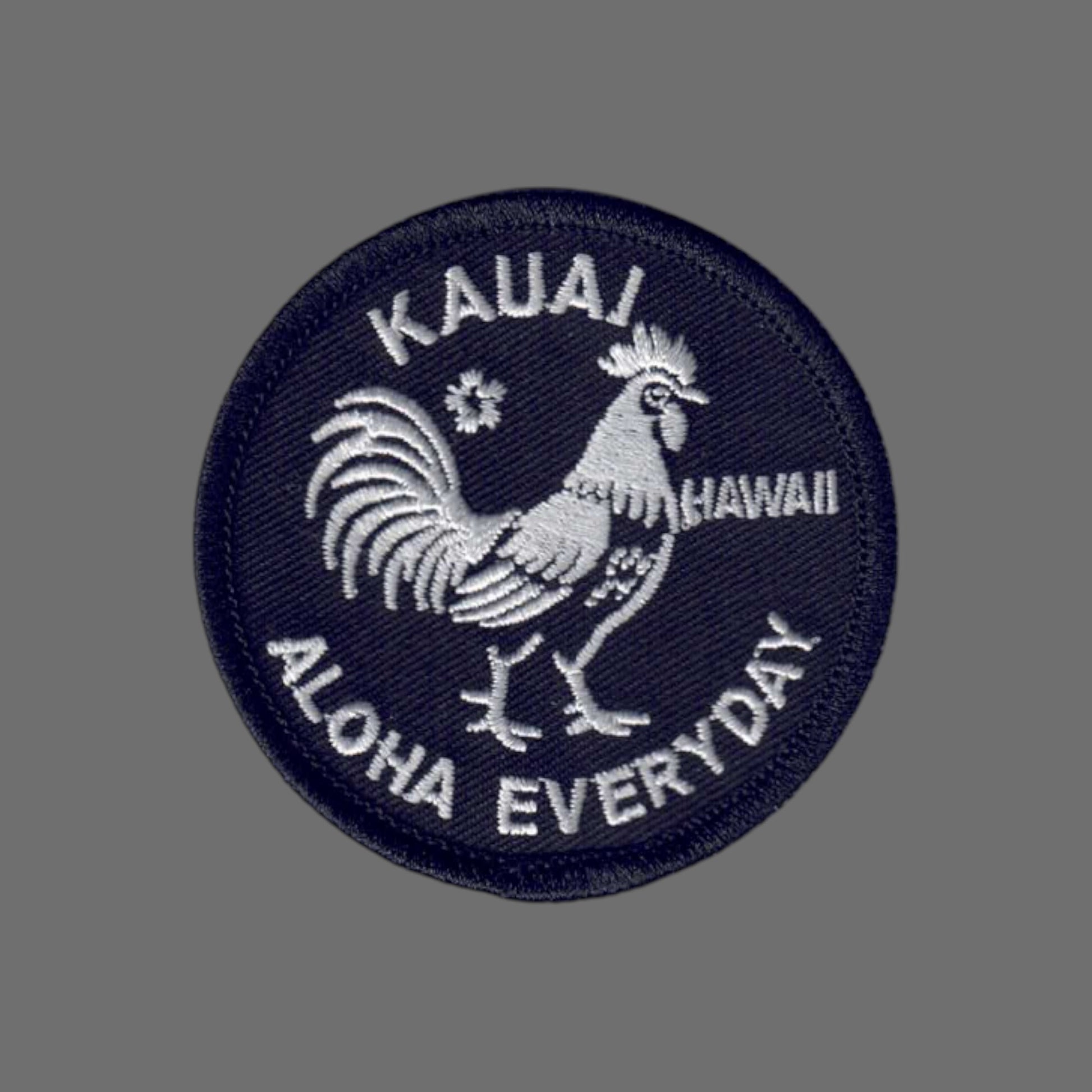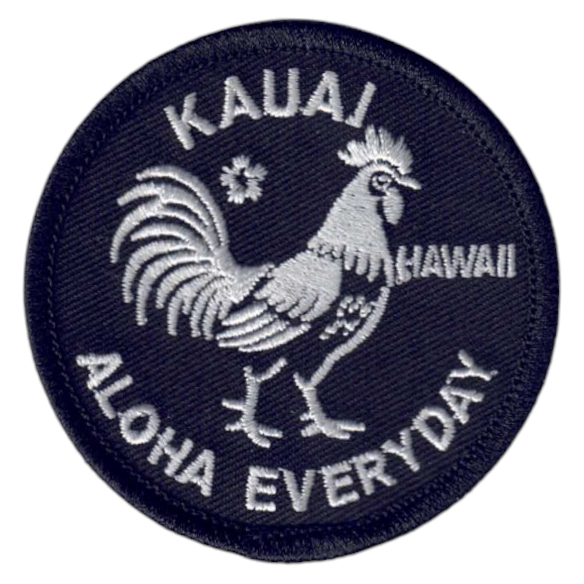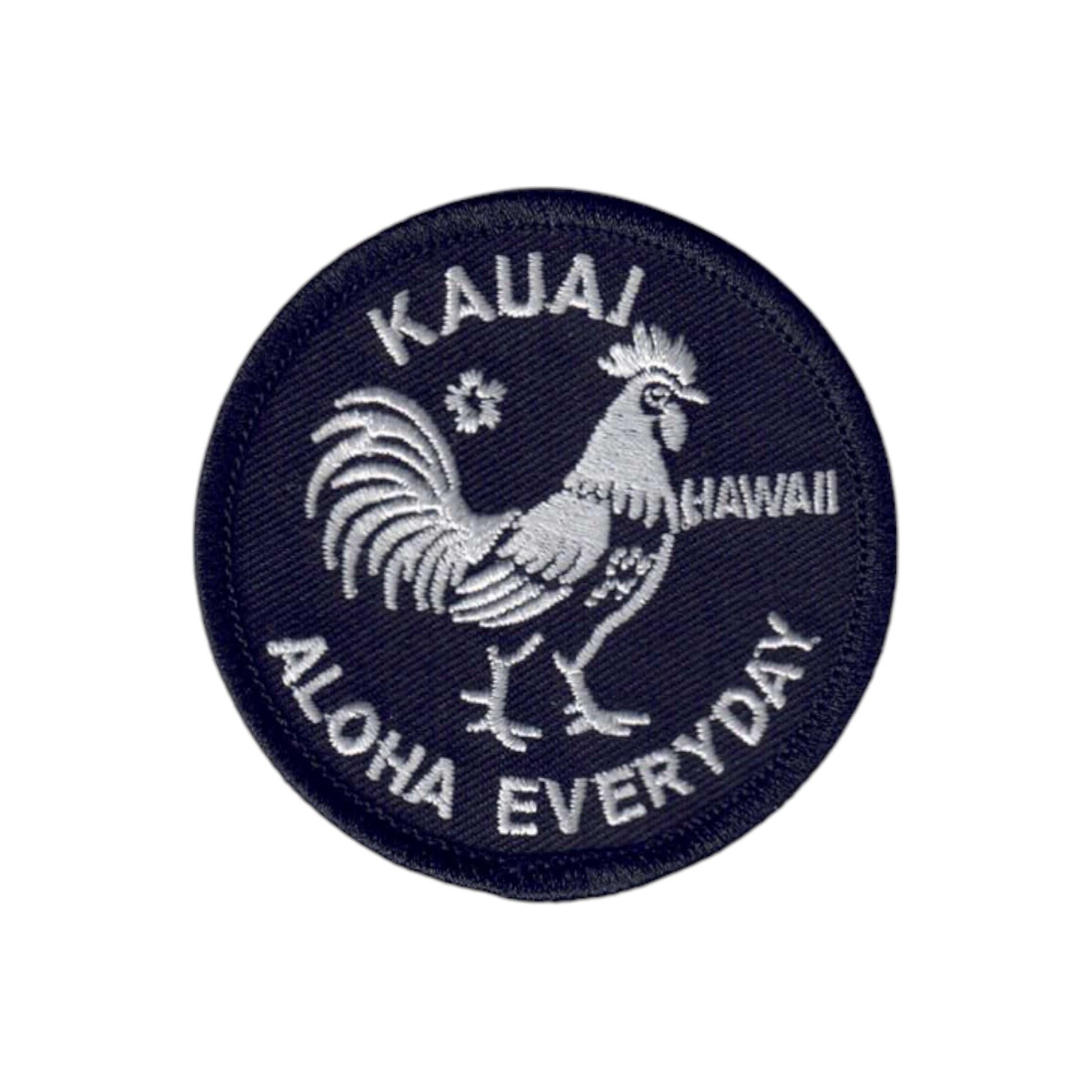 Kauai Black and White Patch, Badge, or Emblem. Text says Hawaii Aloha Everyday and features a Rooster and Hibiscus flower