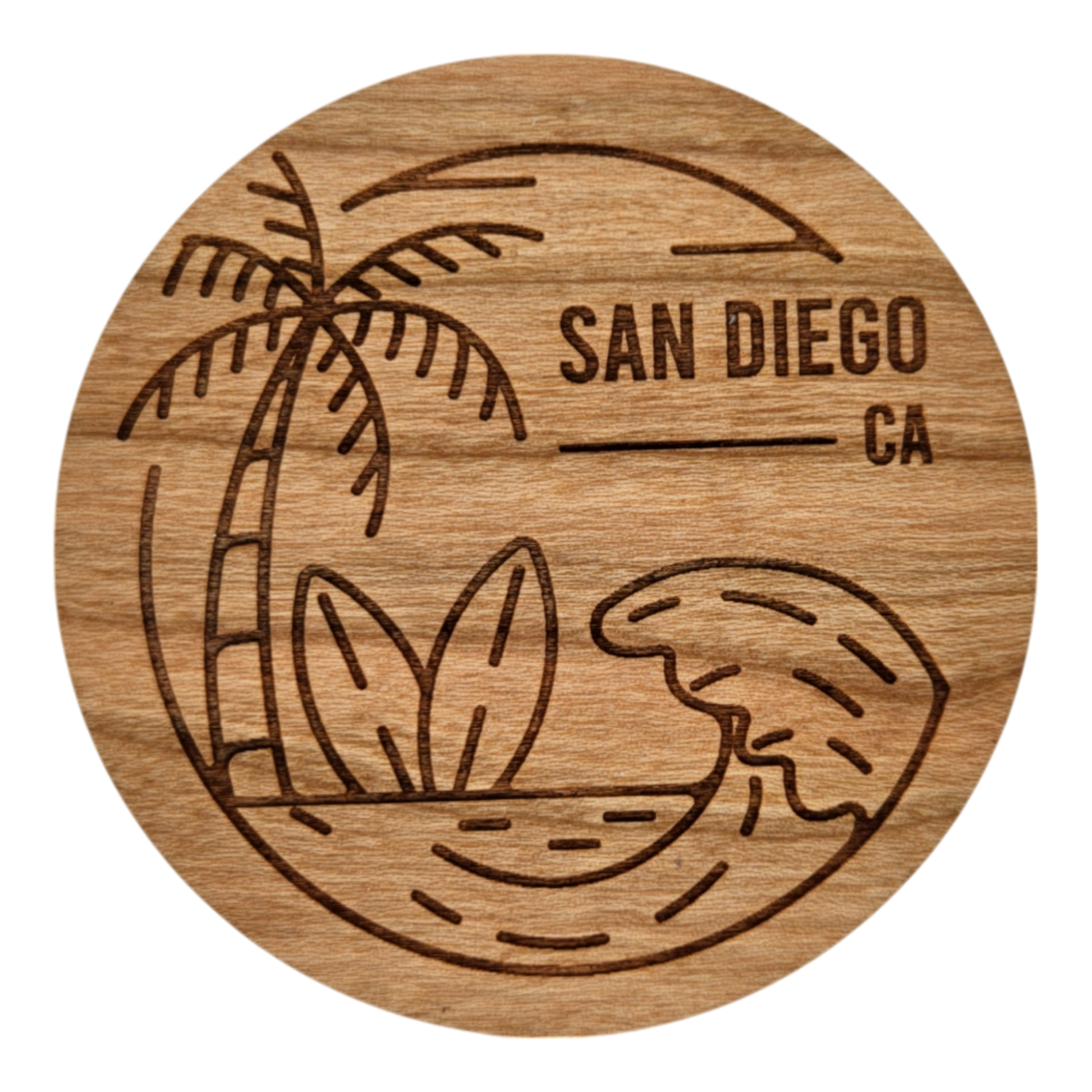 Our San Diego CA Beach Scene with Surfboard, Palm Trees, and waves Handmade Magnets are made out of wood here in California and are approximately 2.5" x 2.5" x .13" thick.