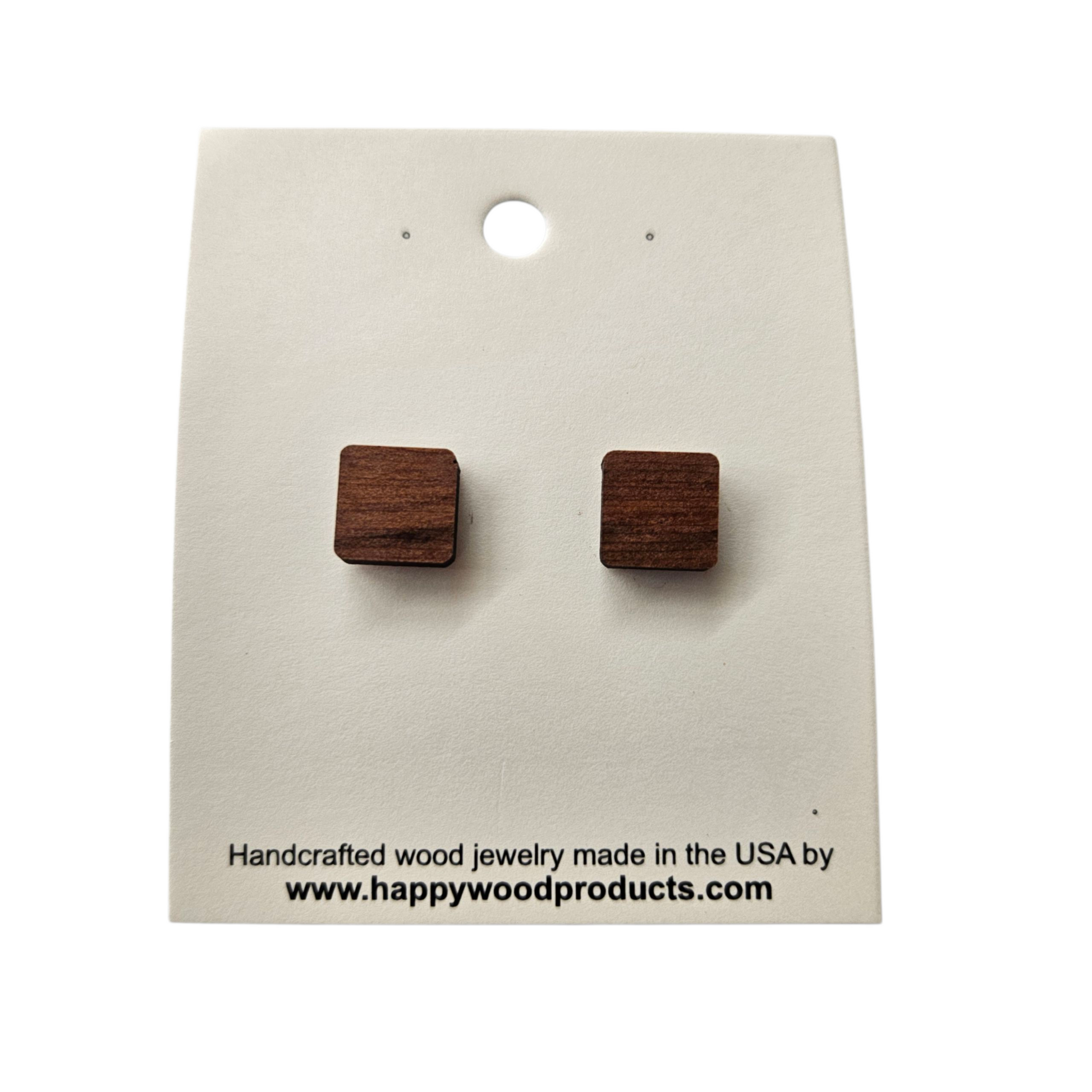 Wood earrings in a small Square Shape handcrafted from wood in the USA in a small father and daughter wood shop in Northern California.
