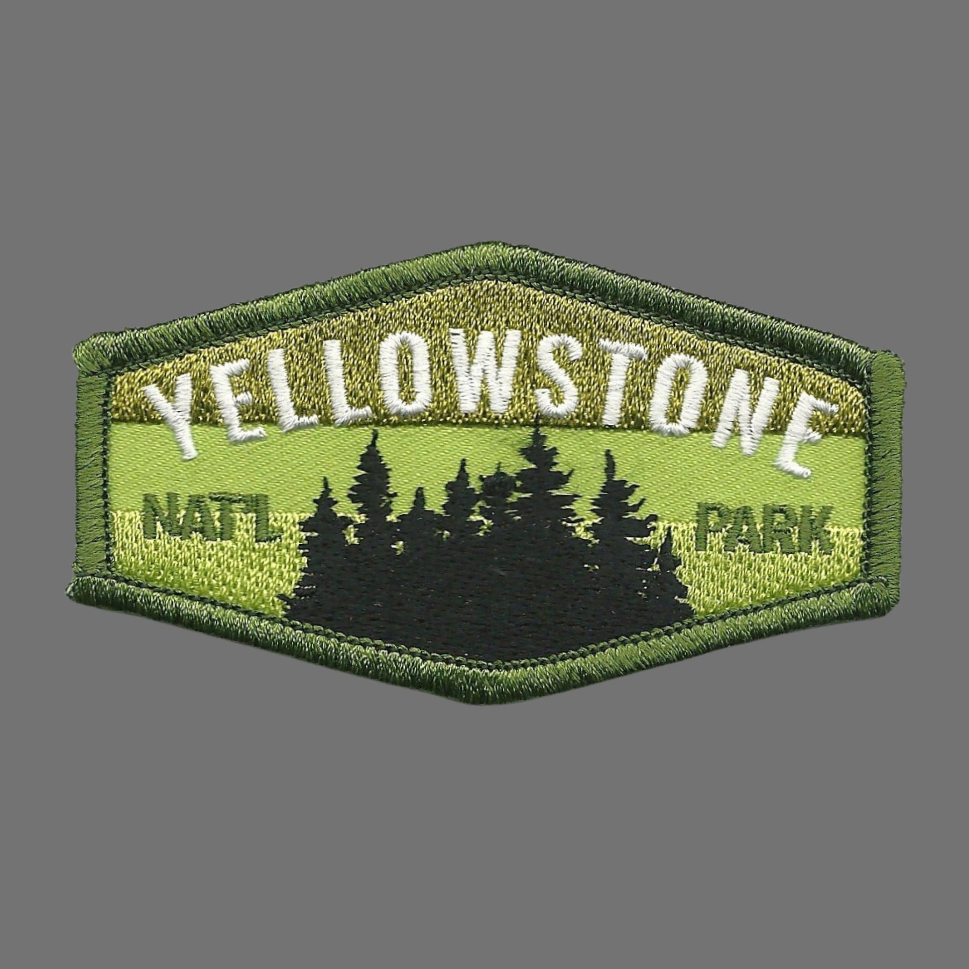 Yellowstone National Park Patch or Embroidered Applique. Text says Yellowstone Natl. Park and features trees. A Great Collectible Travel Souvenir for one of our most well known national parks in Wyoming.