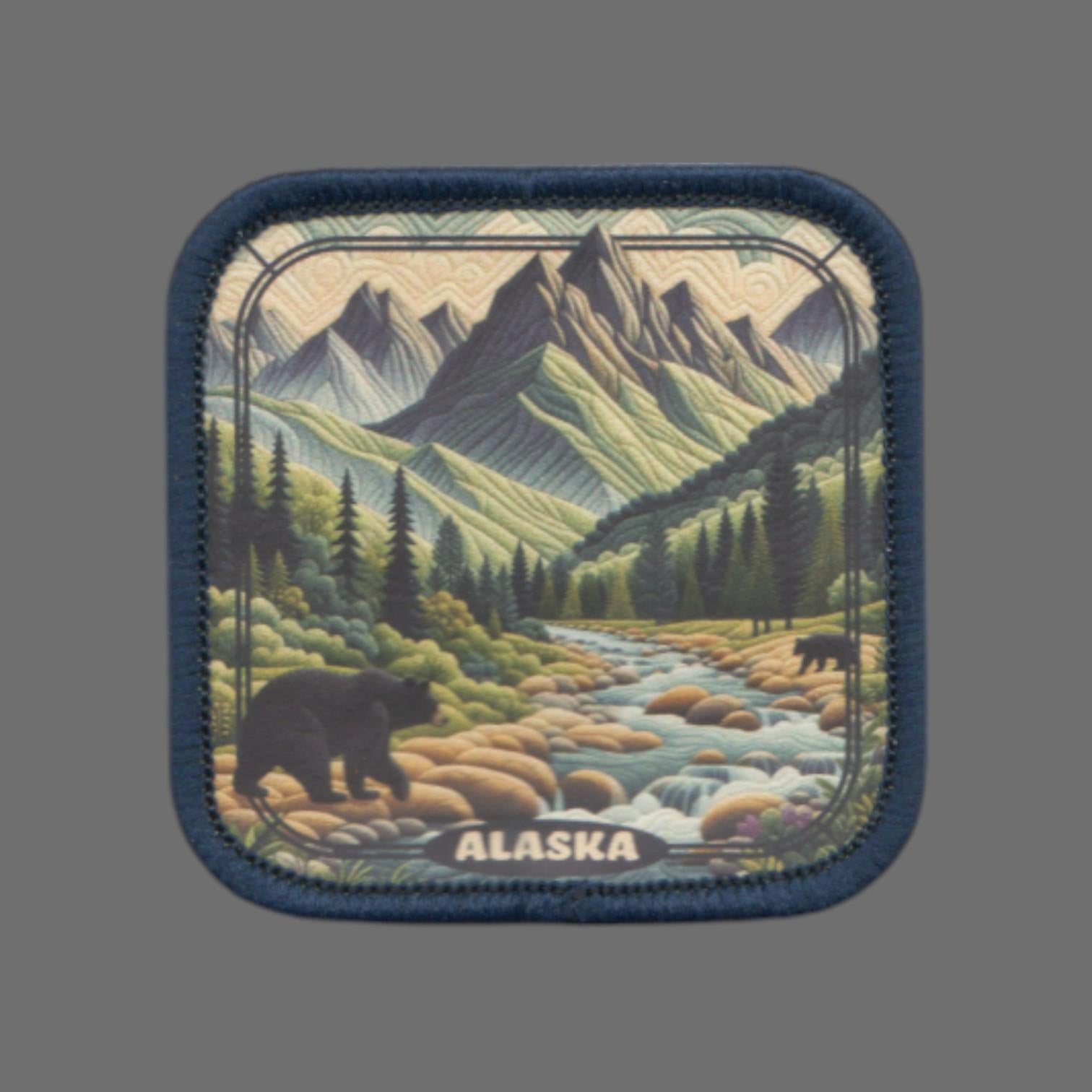 Alaska State Patch or Applique. Text says Alaska and features mountains, a creek, trees and black bears. Please note this is a new type of patch that's printed onto a rubbery vinyl type of material.
