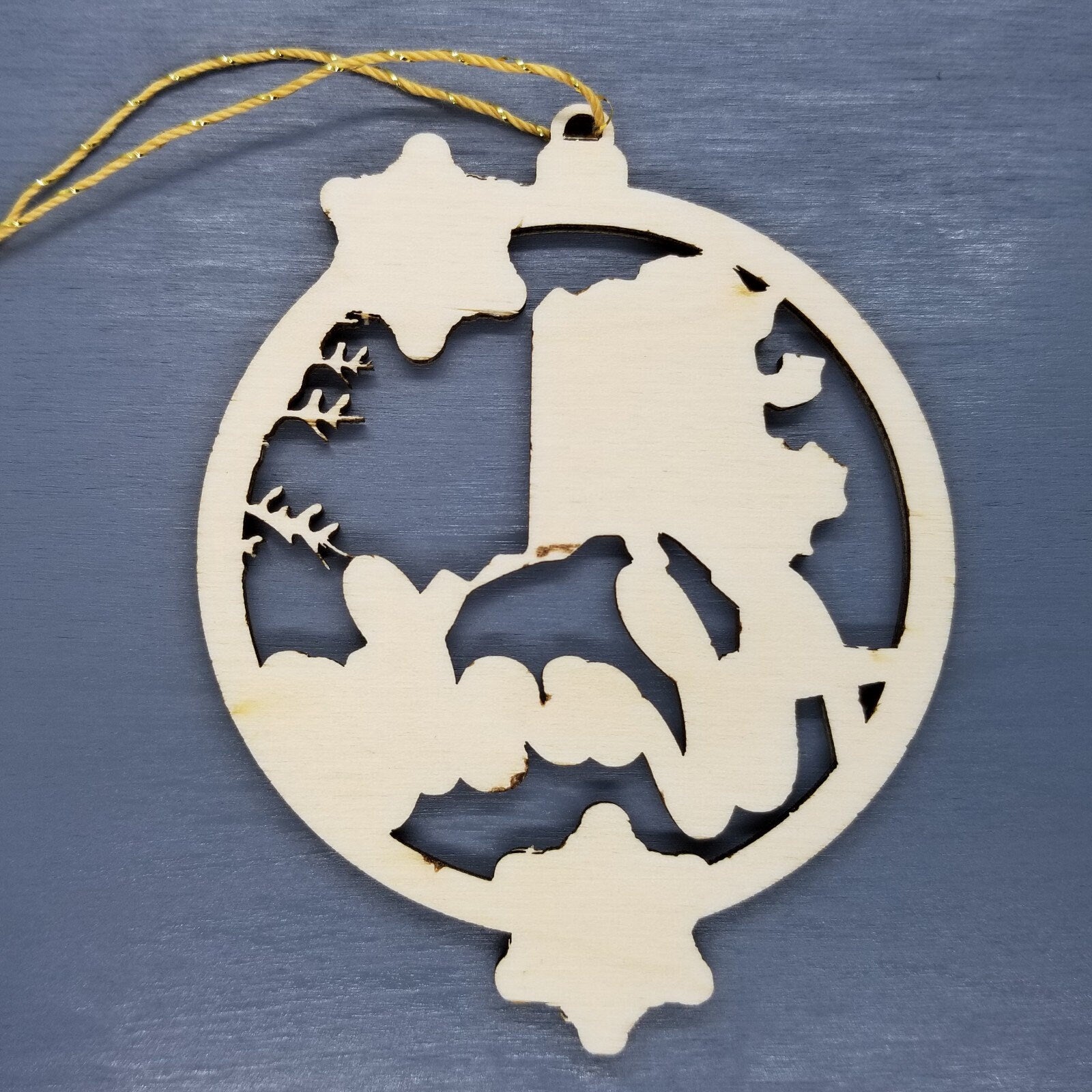 Our Christmas ornaments are sanded, and then the design is cut out by laser, re-sanded by hand, and then, strung by hand. Please note there may be black and or brown marks on back of ornament due to the cutting process.