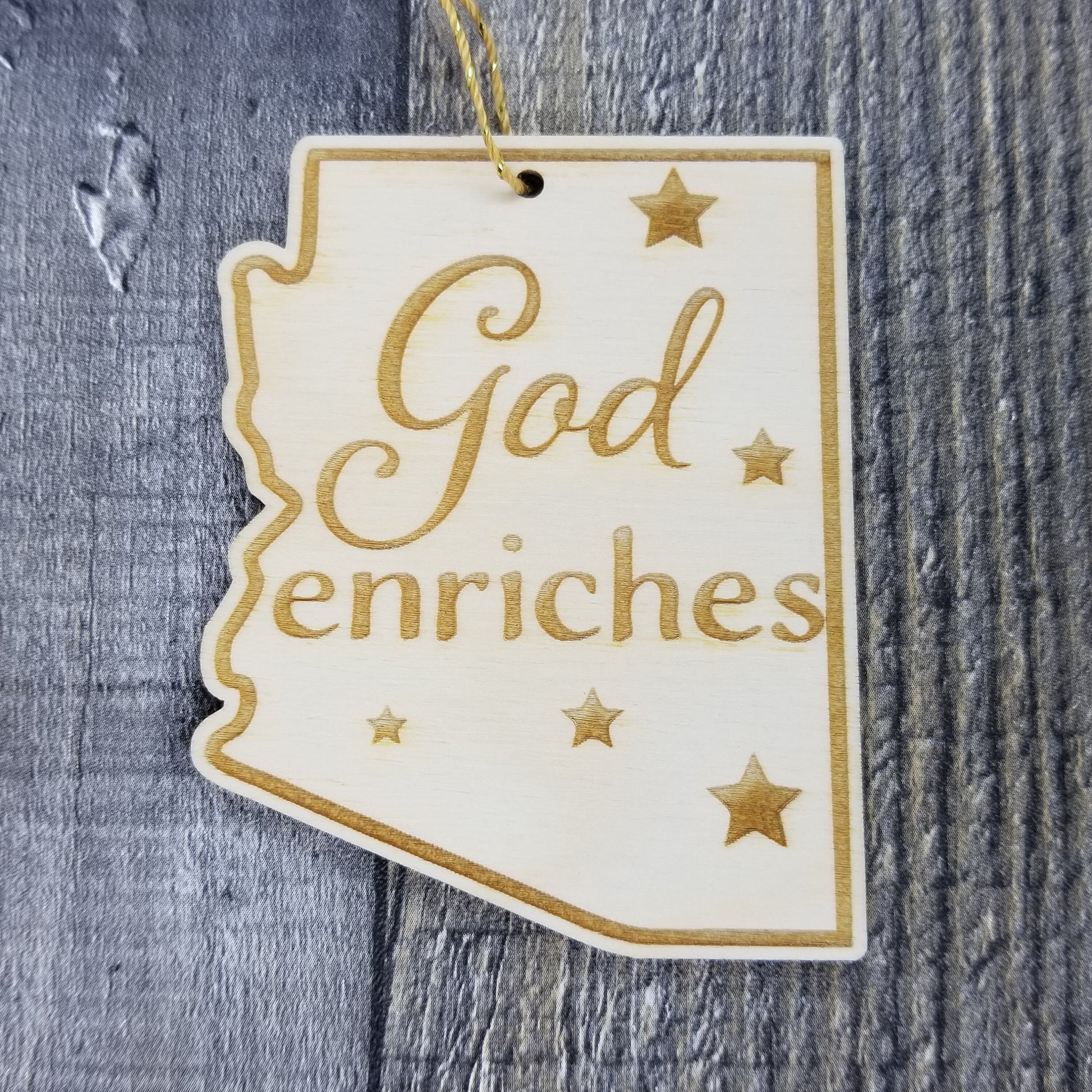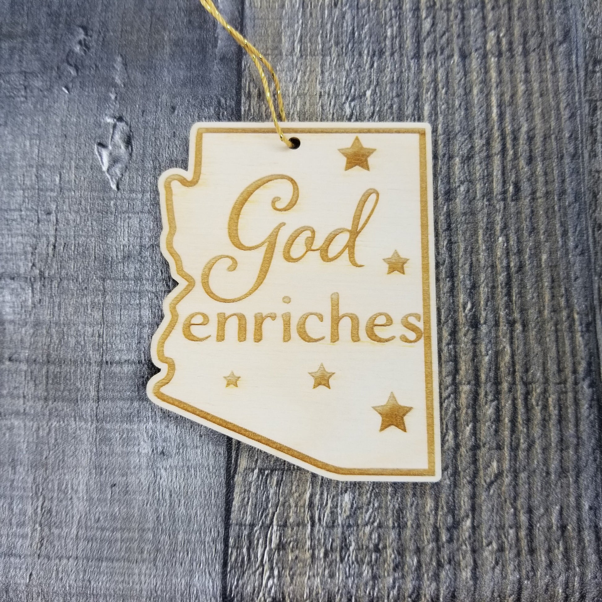 This Arizona Ornament is handmade from wood. The cutout and engraved design depicts the state shape of AZ, and the state motto - God Enriches