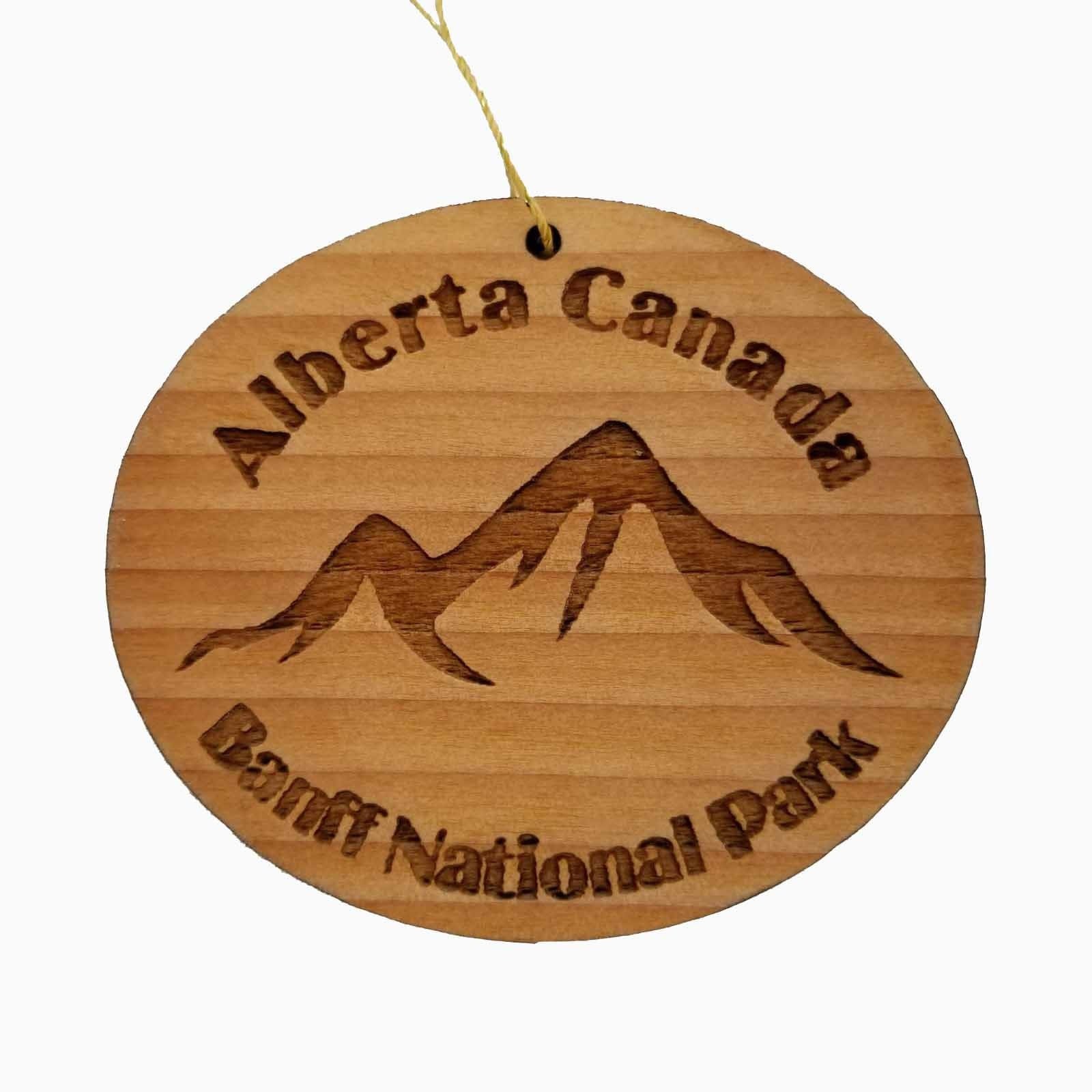 Alberta Canada Souvenir Ornament with Mountains and engraved with a Alberta Canada Banff National Park namedrop. These wood laser cut handmade ornaments are made in our little father and daughter woodshop in northern California and make a great Innsbruck Austria souvenir or memento.