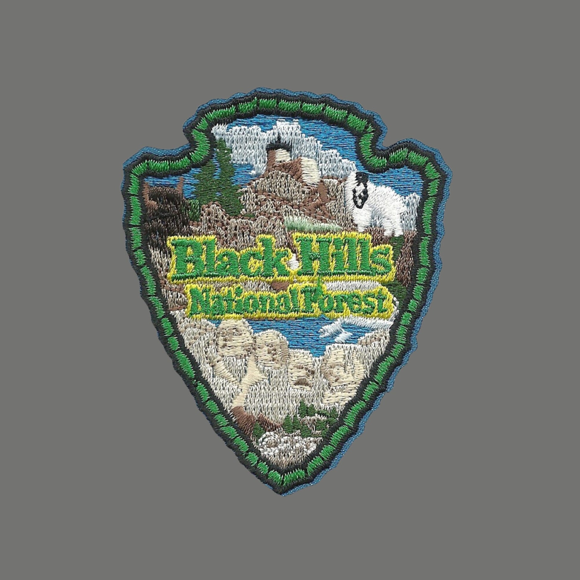 Black Hills National Forest Collectible Patch or Applique. Text says Black Hills National Forest in an Arrowhead shape.