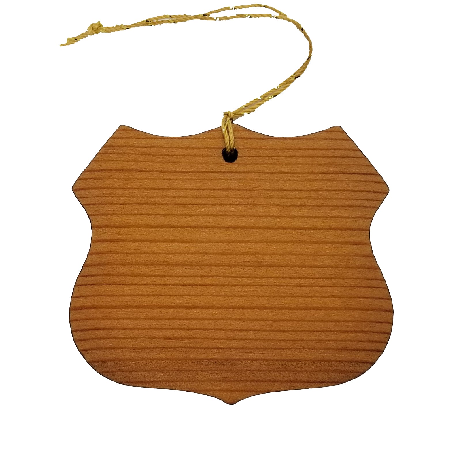 A wood ornament honoring the Highway starting in California going through Oregon and ending in Washington