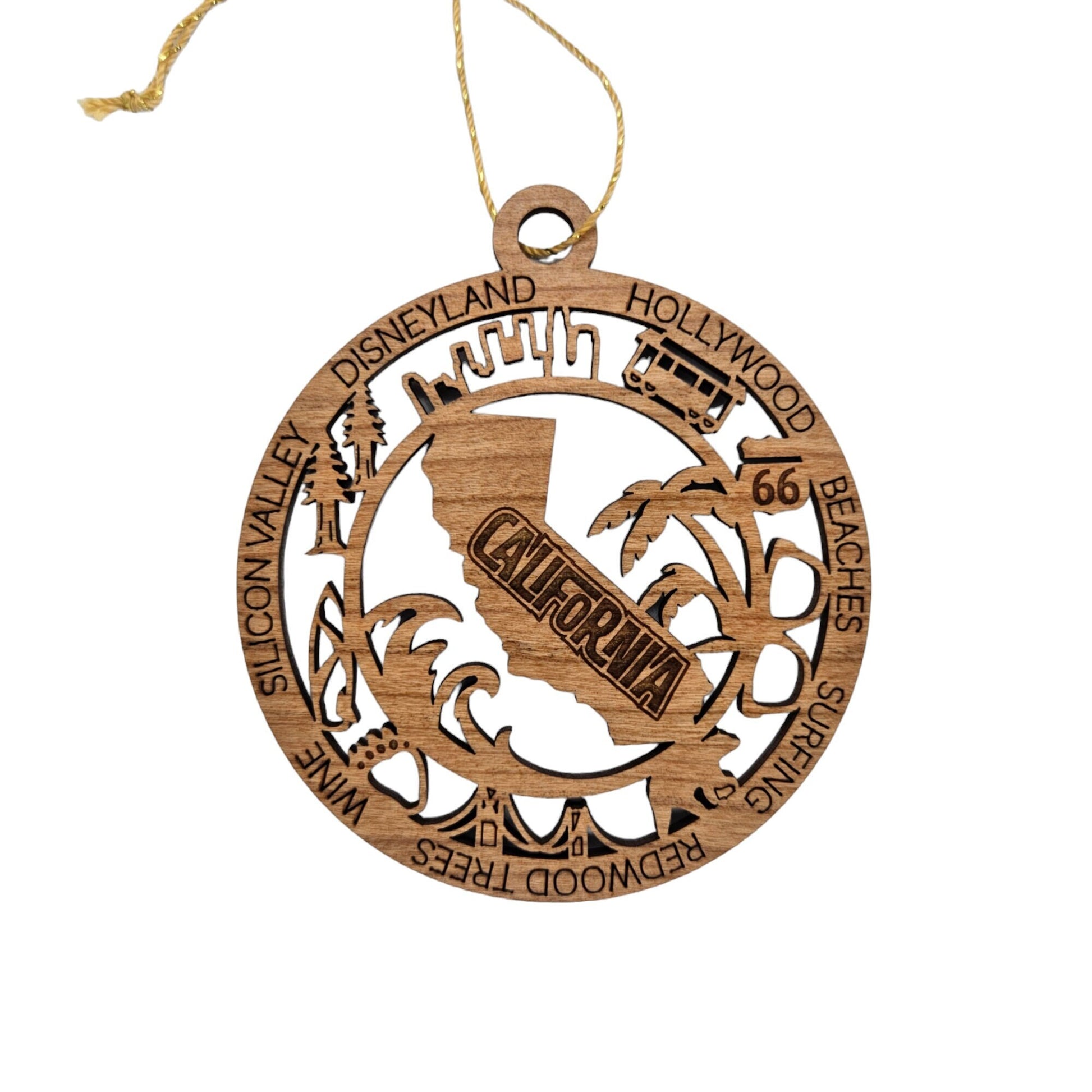 This California Ornament is handmade from wood. The cutout and engraved design depicts the state shape of CA, and a variety of things California is known for such as Golden Gate Bridge, Palm Trees, Bear, Bear Paw, Surfboard, Route 66 Sign Trolley, and more. Each wood Ornament will vary slightly in color, grain, knots, etc. Pictures are just a general representation of what you will receive.