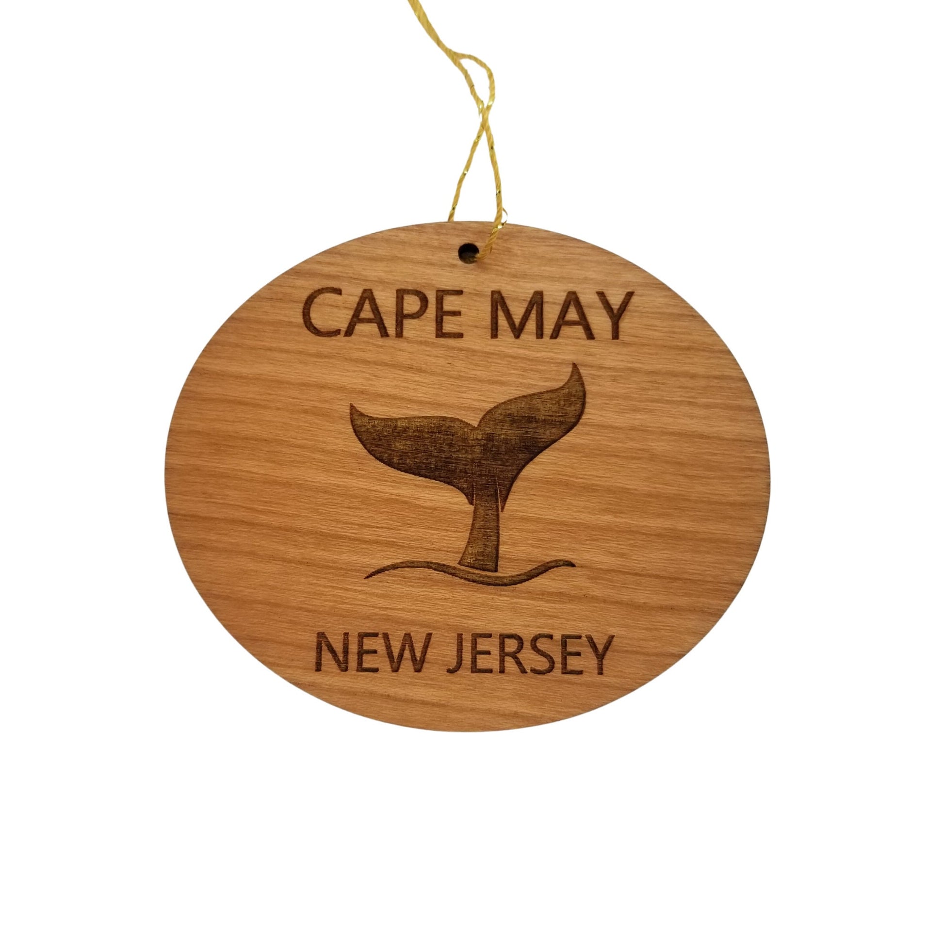Cape May Souvenir Ornament with a Whale Tail and engraved with a Cape May New Jersey namedrop. These wood laser cut handmade ornaments are made in our little father and daughter woodshop in northern California and make a great Cape May memento or souvenir for anyone who has visited or is visiting Cape May New Jersey.