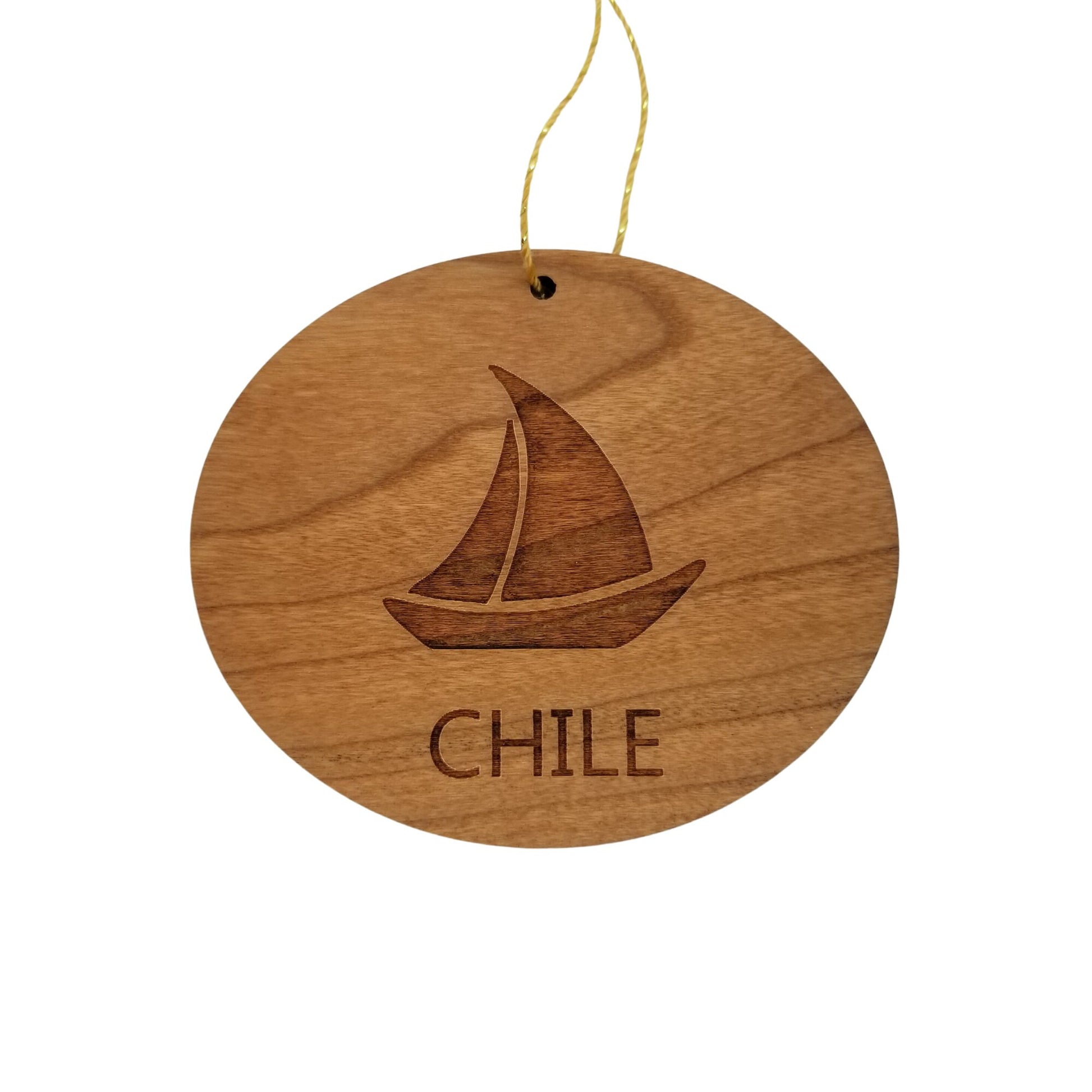Chile Souvenir Ornament with a Sailboat and engraved with a Chile namedrop. These wood laser cut handmade ornaments are made in our little father and daughter woodshop in northern California and make a great Chile souvenir or memento for anyone who has visited or is visiting the Chile.