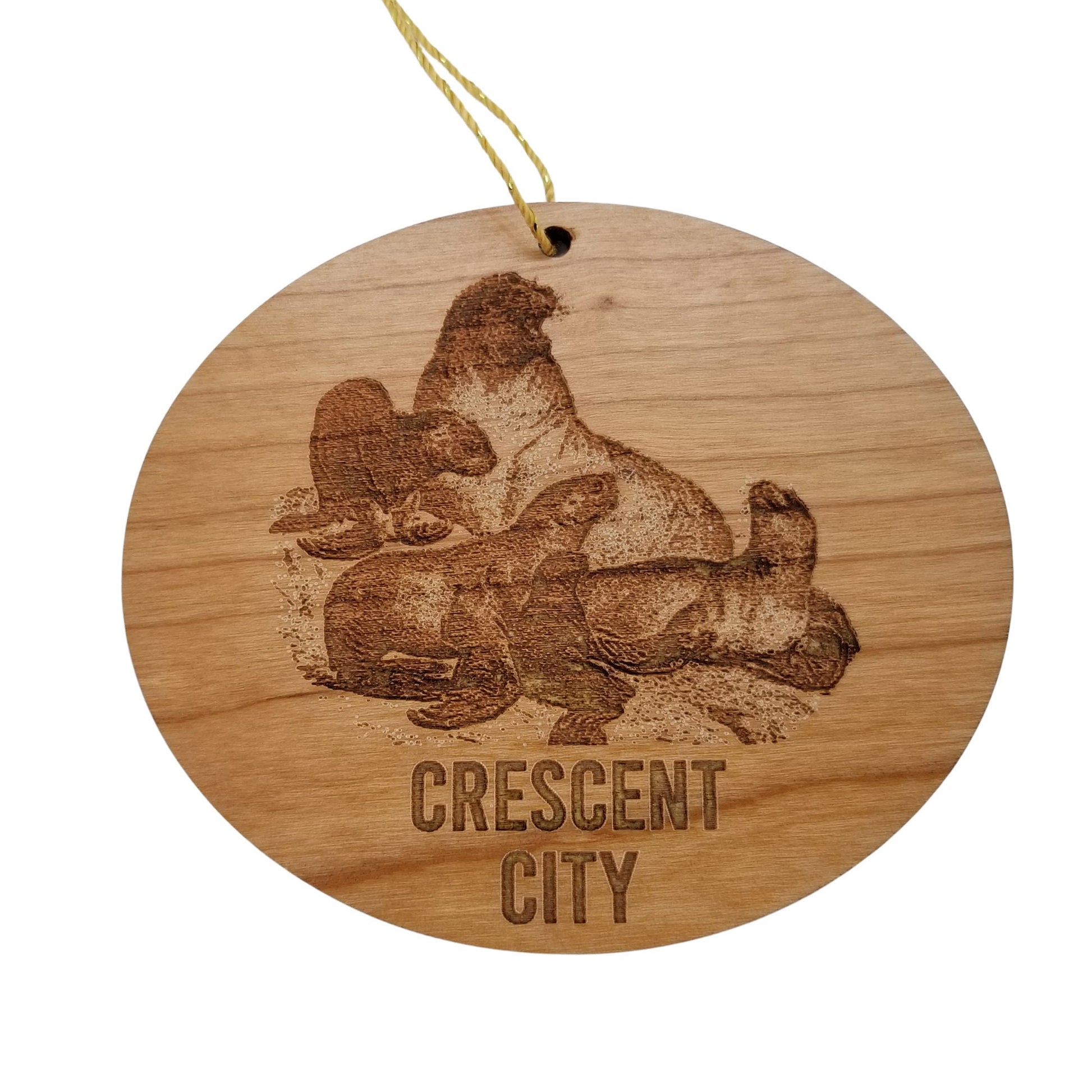 Crescent City CA Souvenir Ornament with Sea Lions and engraved with a Crescent City California namedrop. These wood laser cut handmade ornaments are made in our little father and daughter woodshop in northern California.
