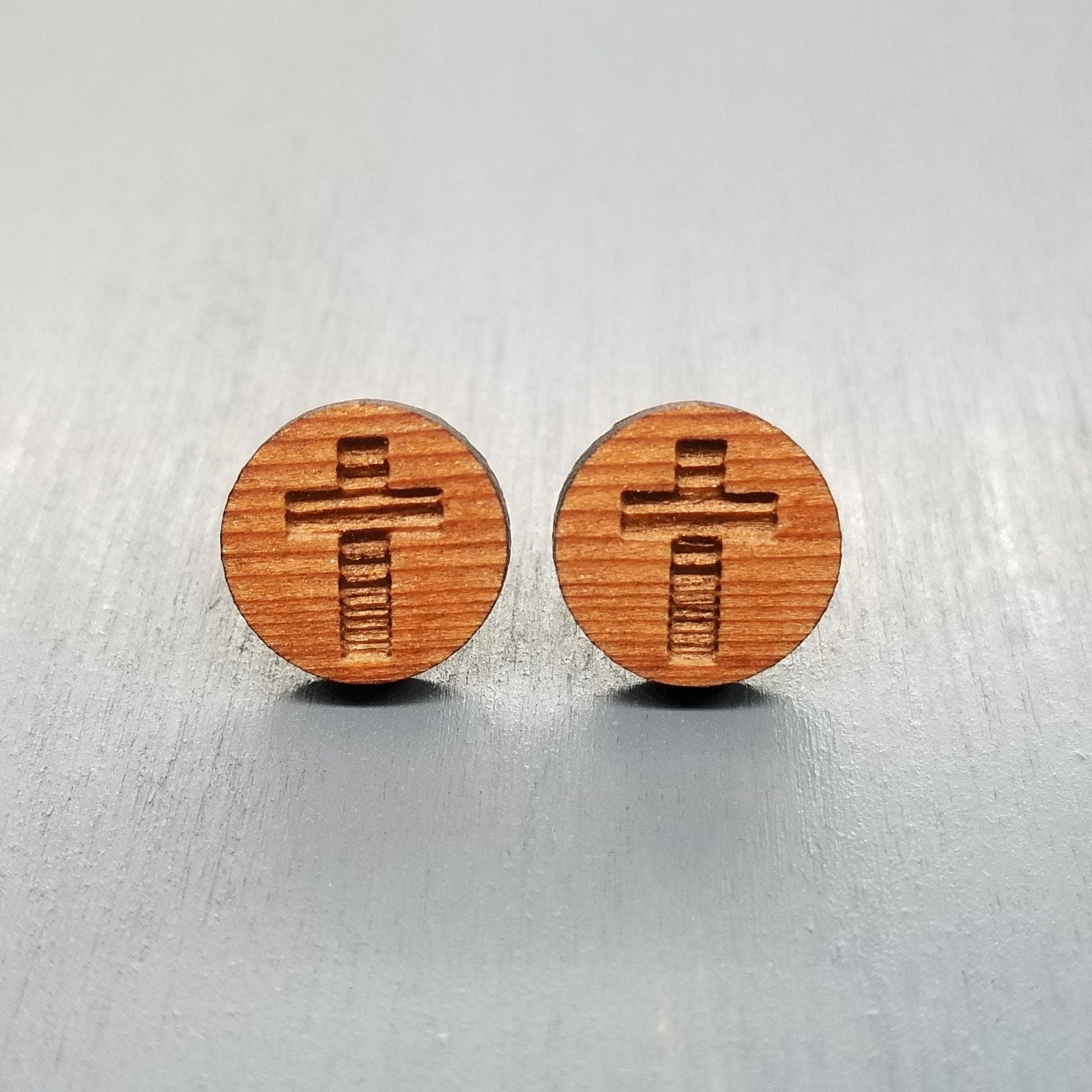 Cross Earrings - Wood Earrings - California Redwood Stud Earrings - Circle Post Earrings - Cross Gift
