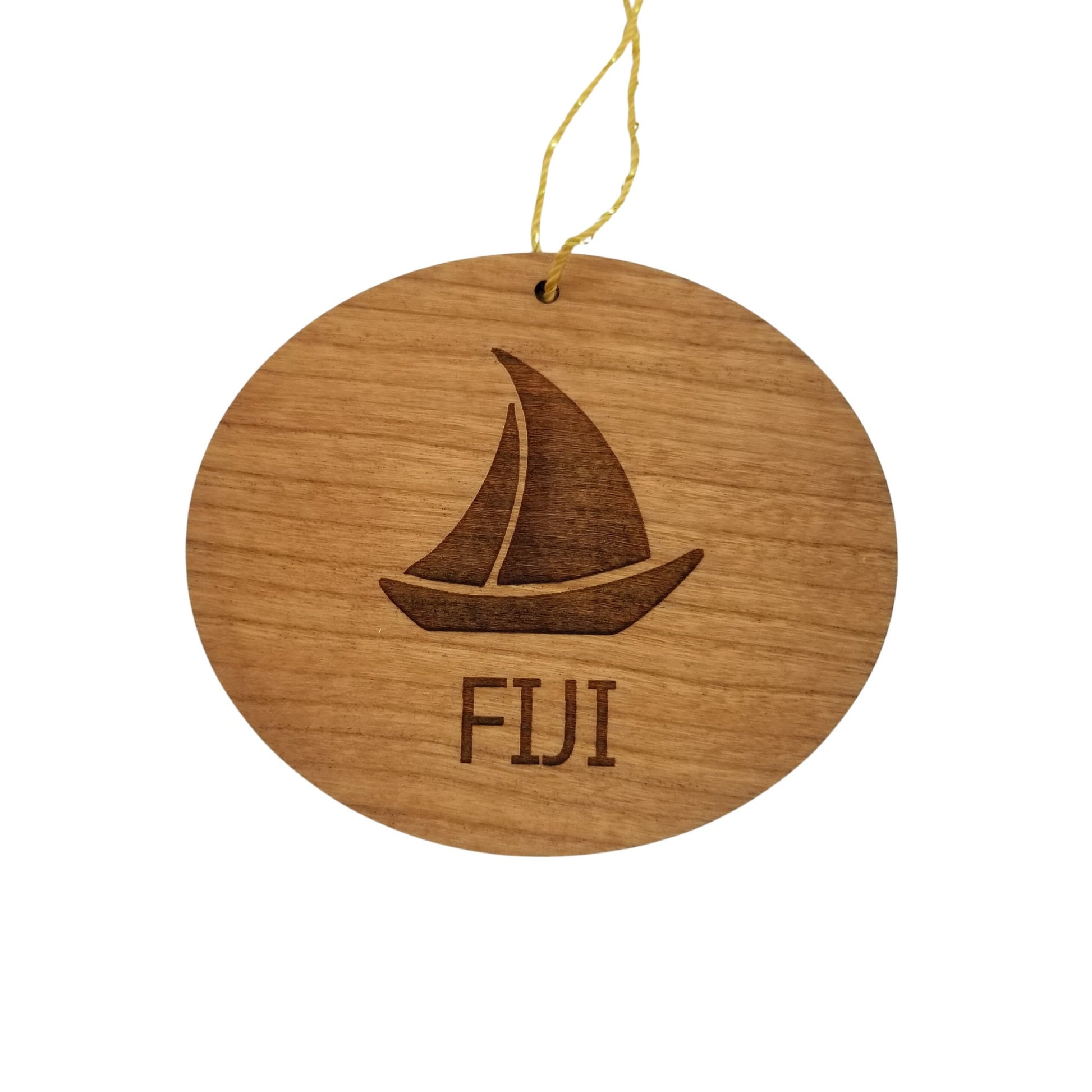 Fiji Souvenir Ornament with a Sailboat and engraved with a Fiji namedrop. These wood laser cut handmade ornaments are made in our little father and daughter woodshop in northern California and make a great Fiji souvenir or memento for anyone who has visited or is visiting Fiji.