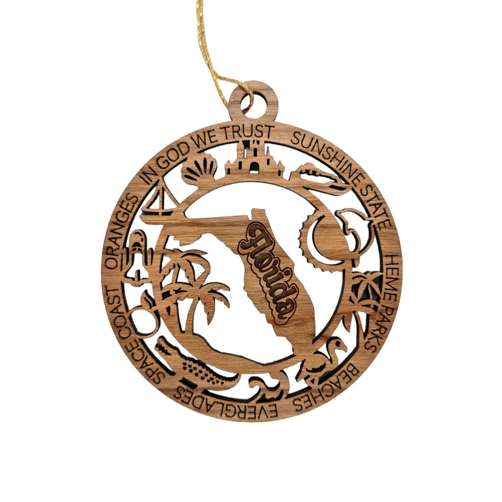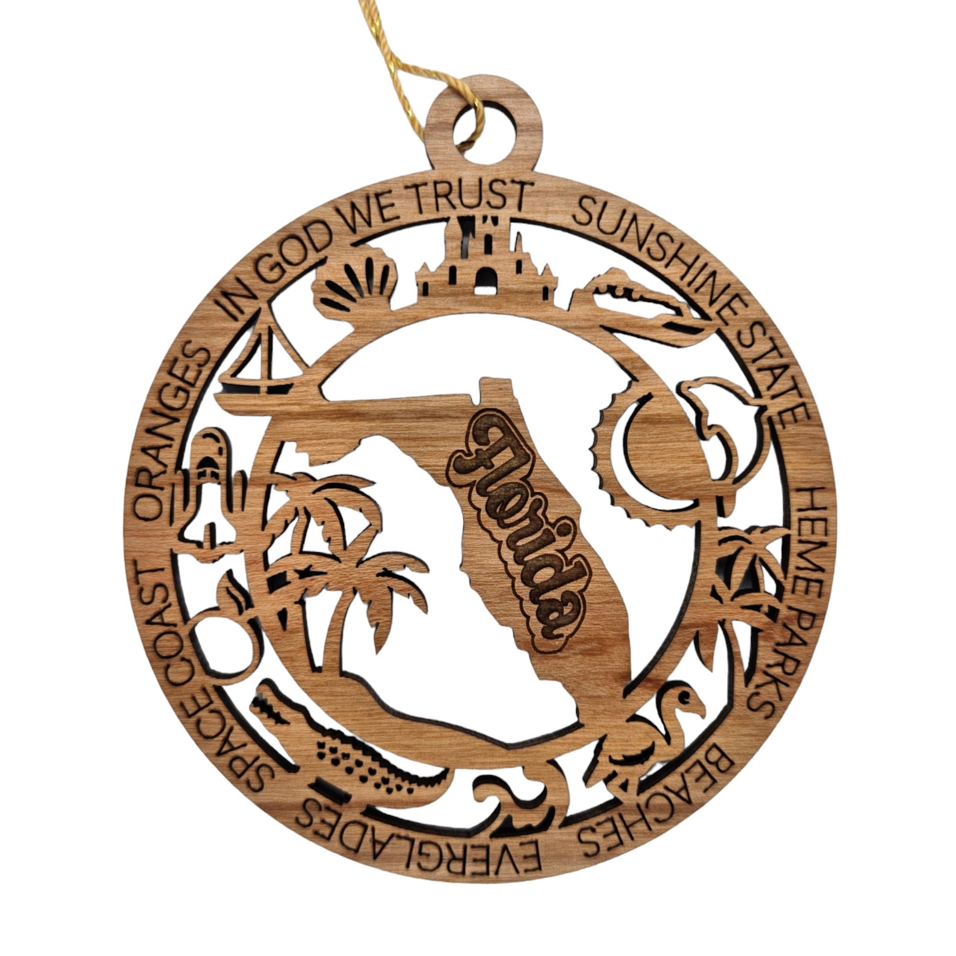 This Florida State Ornament is handmade from wood. The cutout and engraved design depicts the state shape of FL, and a variety of things Florida is known for such as a sailboat, magic castle, sun, palm trees, Peach, seashell, waves, alligator, and more.
