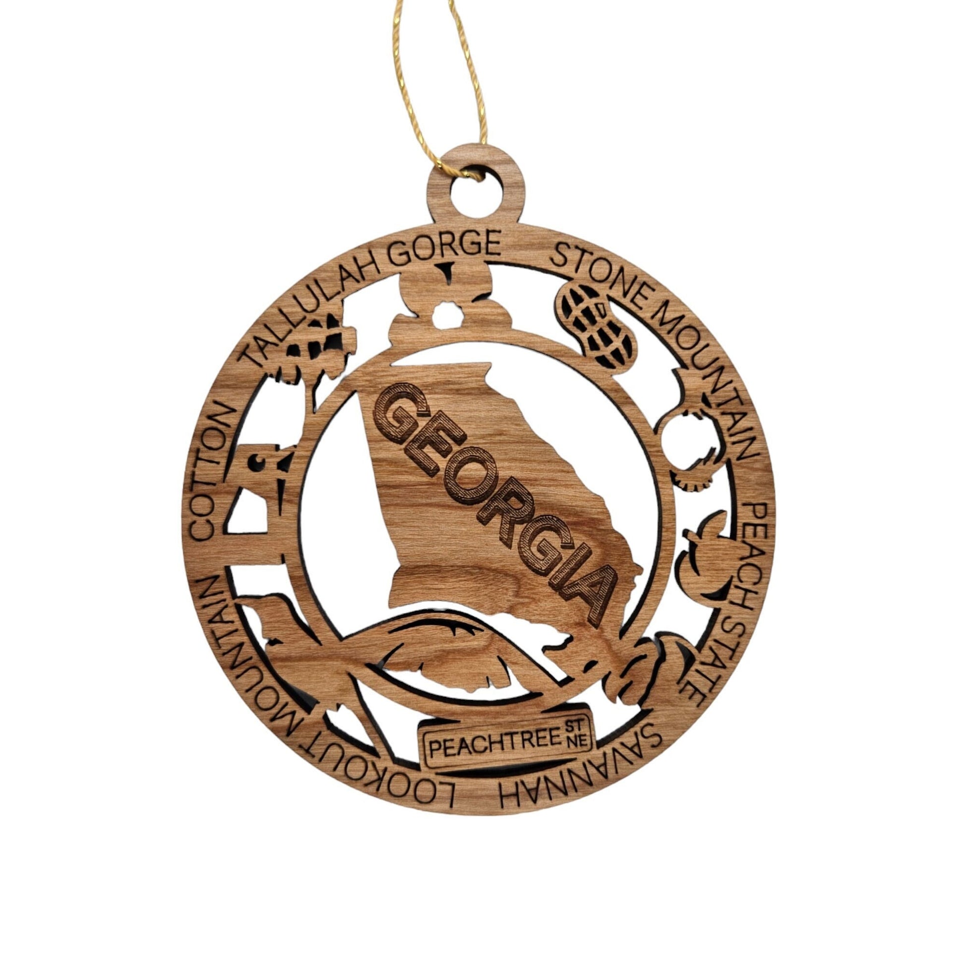 Georgia Wood Ornament - GA Souvenir - Handmade Wood Ornament Made in USA State Shape Peachtree Street Peanuts Spanish Moss Pecan