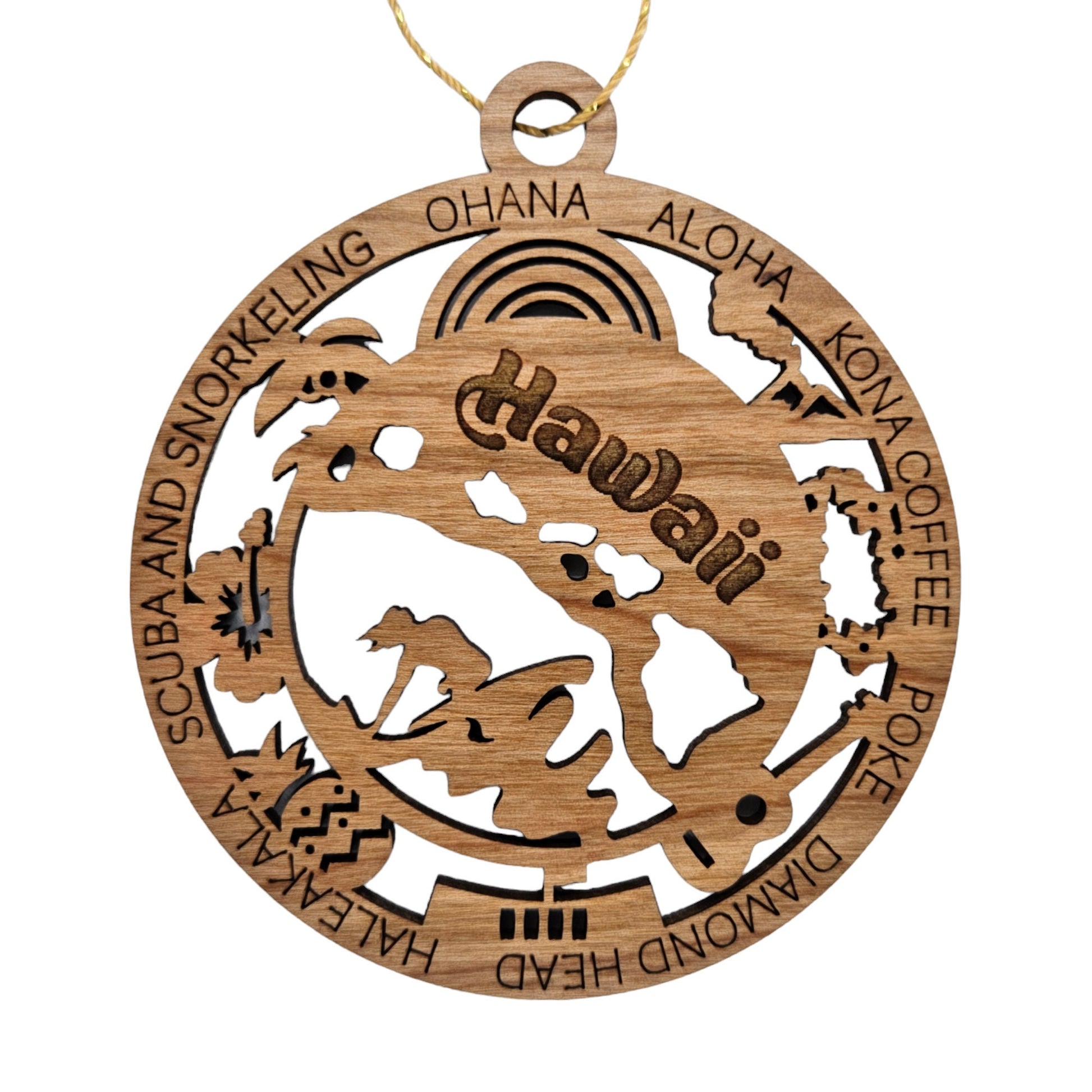 This Hawaii Ornament is handmade from wood. The cutout and engraved design depicts the state shape of HI, and a variety of things Hawaii is known for such as a Ukulele, Lei, Surfer, Volcano, Ohana, Kona Coffee, Poke, and more. Each wood Ornament will vary slightly in color, grain, knots, etc. Pictures are just a general representation of what you will receive.