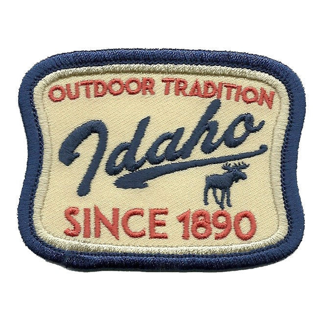 ID Patch souvenir’s text says Idaho Outdoor Tradition Since 1890. Vintage Retro Theme