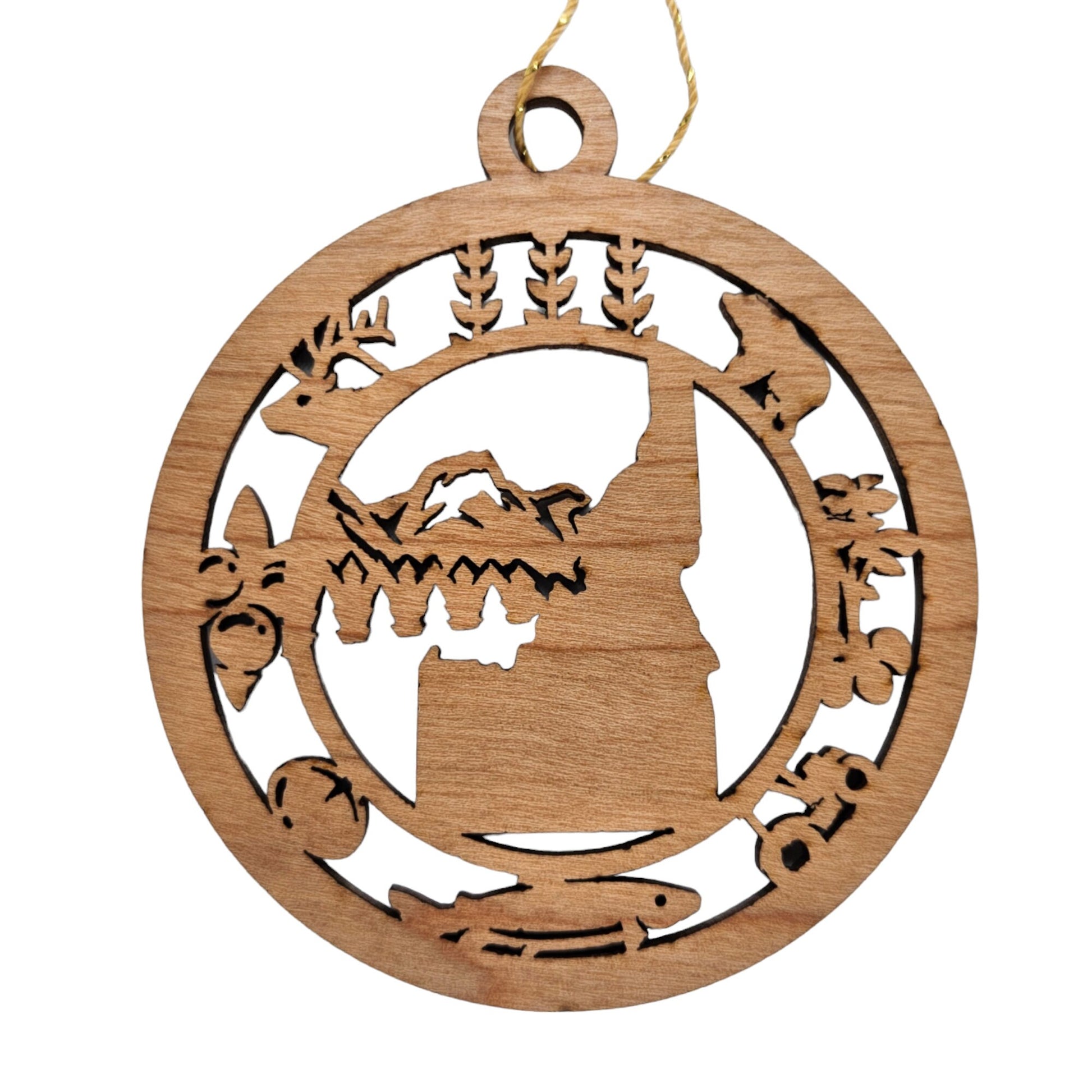 This Idaho Ornament is handmade from wood. The cutout and engraved design depicts the state shape of ID, and a variety of things Idaho s known for such as a Star Garnet, Berries, Elk, Sandpoint, Lava Hot Springs, Sun Valley, and more. Each wood Ornament will vary slightly in color, grain, knots, etc. Pictures are just a general representation of what you will receive.