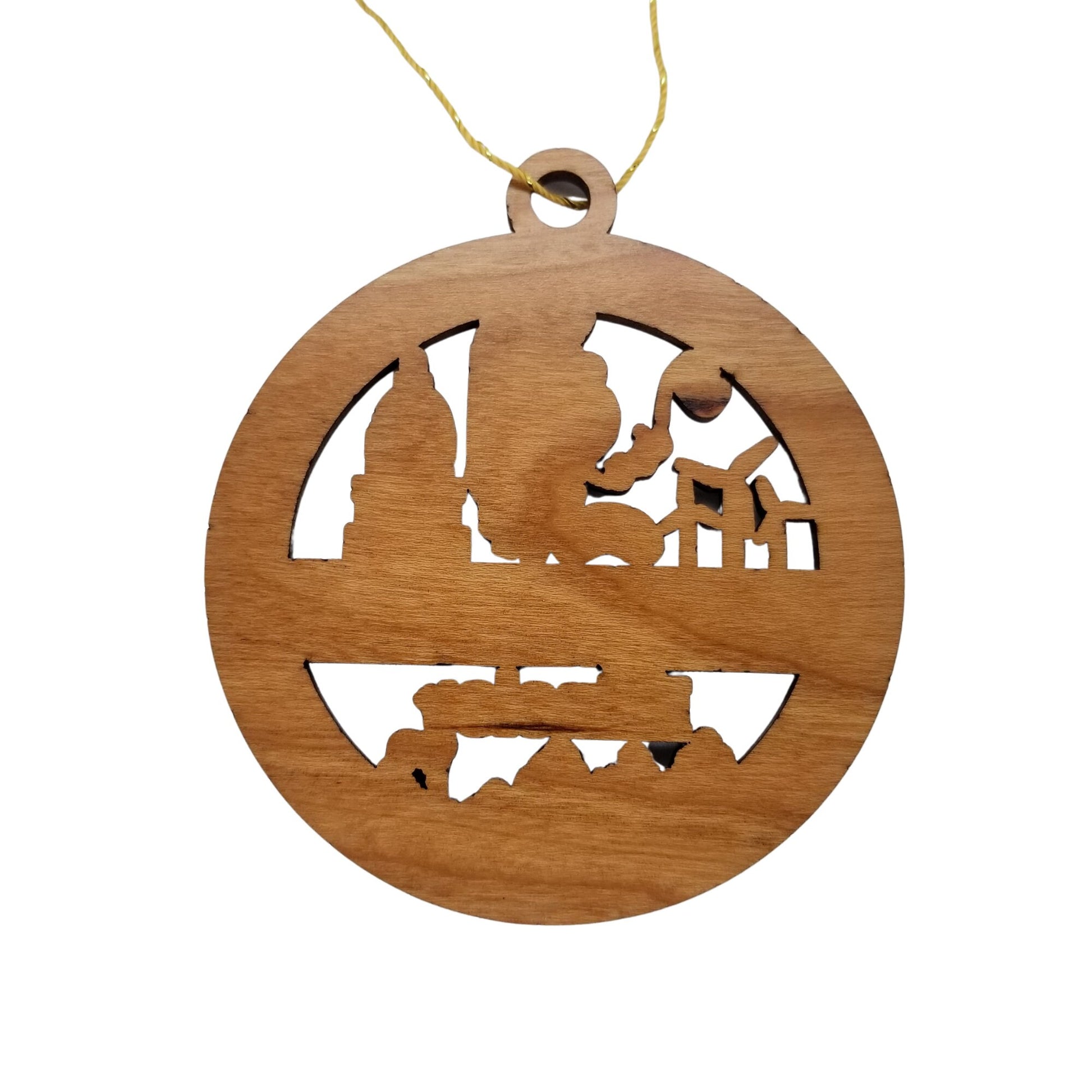 This Illinois Ornament is handmade from wood. The cutout and engraved design depicts the state shape of IL, and a variety of things Illinois is known for such as Deer, Mountains, Trees, the Capitol Building, Wine, Pick Axe, and more.