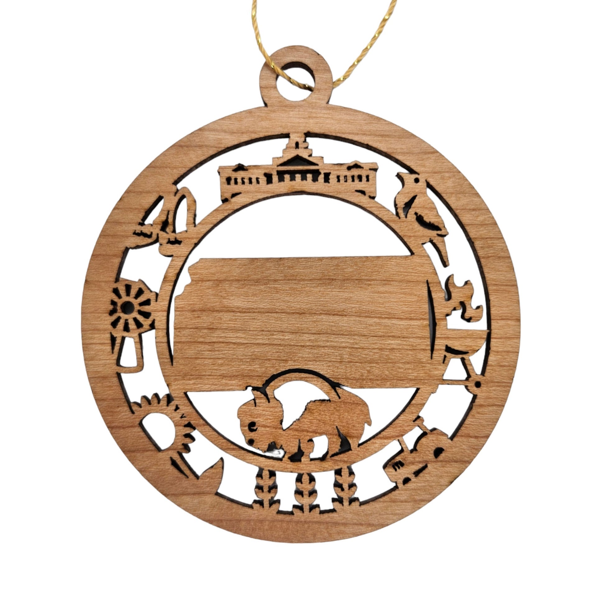 This Kansas Ornament is handmade from wood. The cutout and engraved design depicts the state shape of KS, and a variety of things Kansas is known for such as Wheat, Sunflower, Windmill, Ballet Shoes, Buffalo, and more.