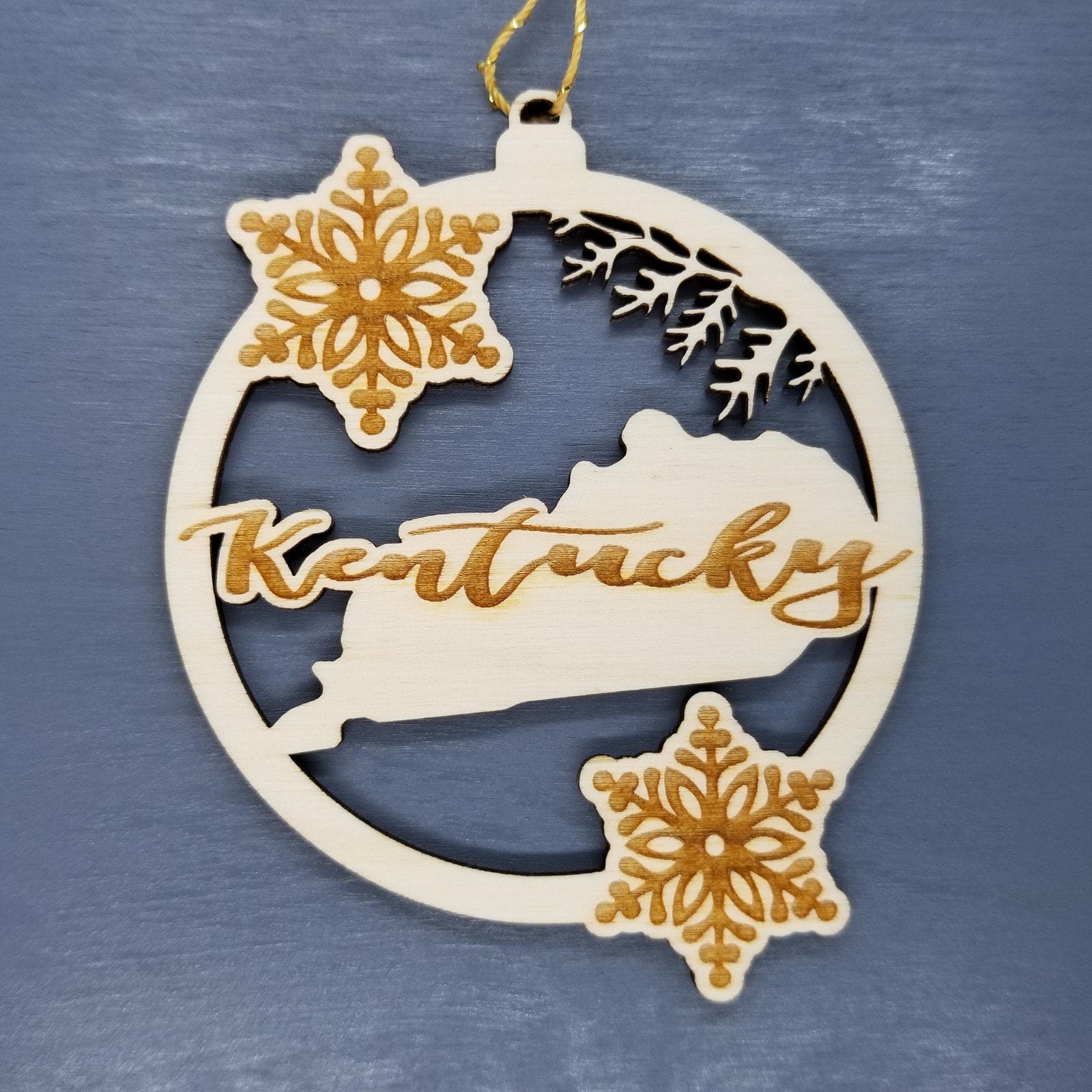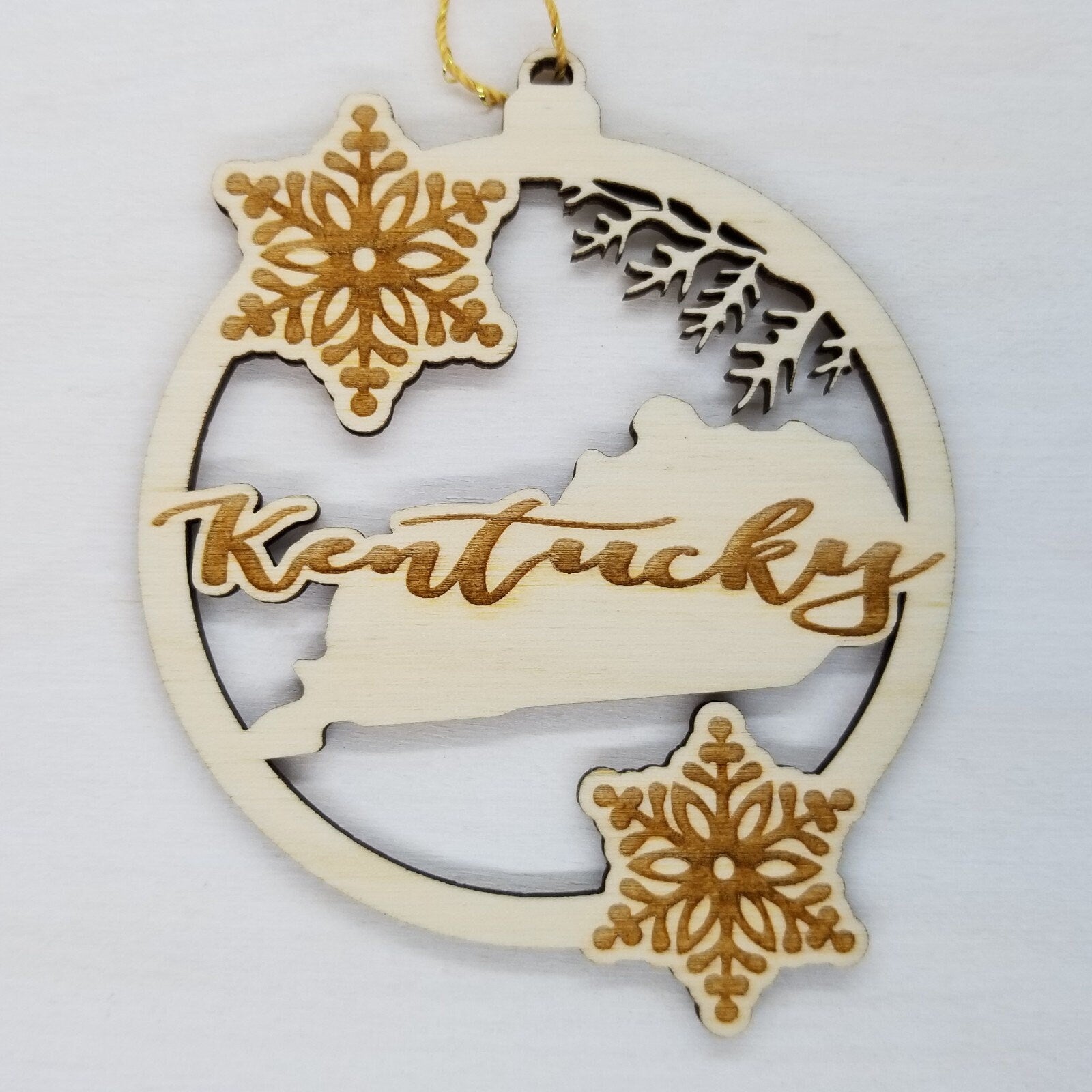 This Kentucky State Ornament is handmade from wood. The cutout and engraved design depicts a the state shape of KY, branches, and snowflakes.