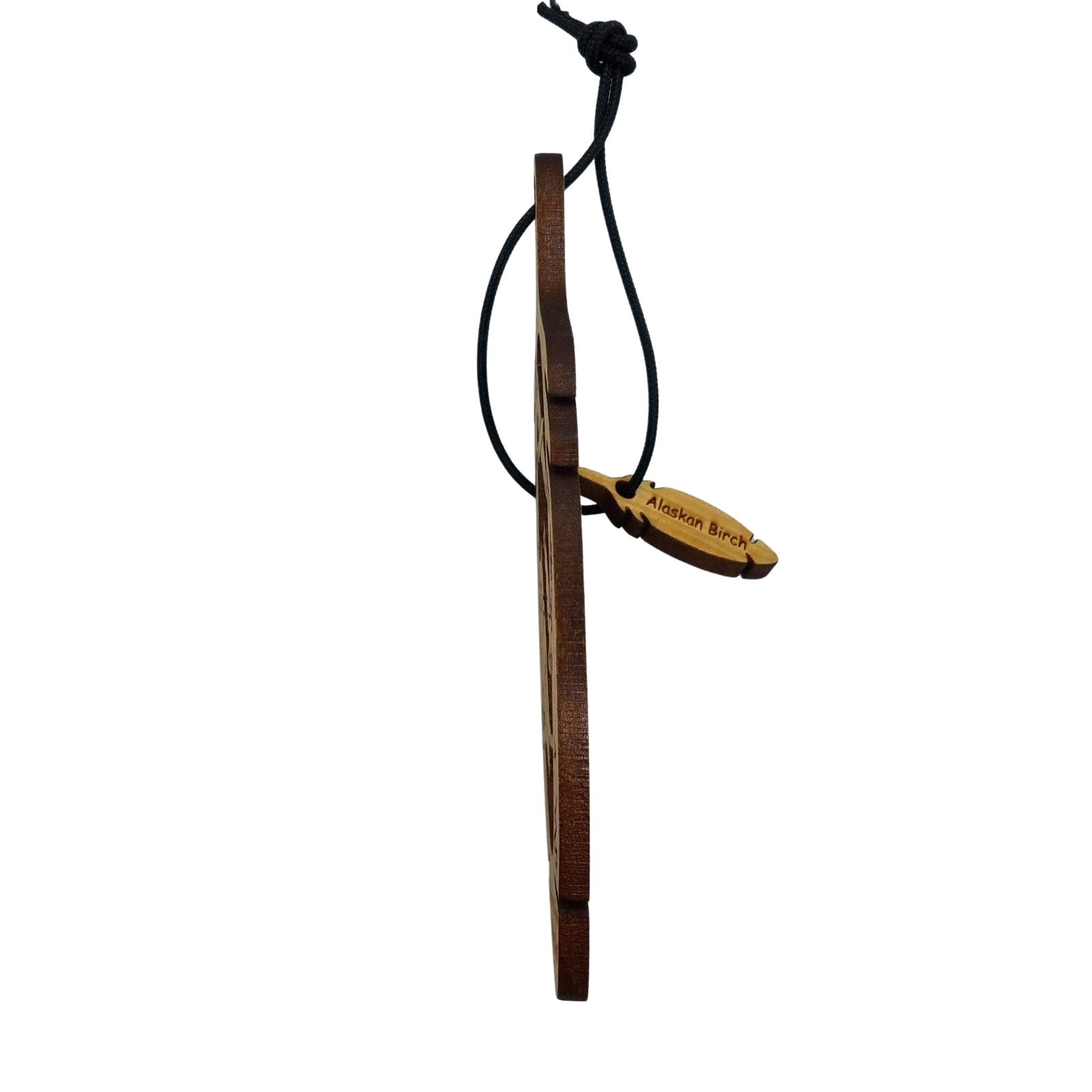 Ketchikan AK Owl and Birds Flying Christmas ornament is made out of wood, is laser cut and engraved has the words Ketchikan Alaska as the namedrop. This Alaska Birds ornament depicts a an owl and two birds in flight cutout inside of a leaf shape.
