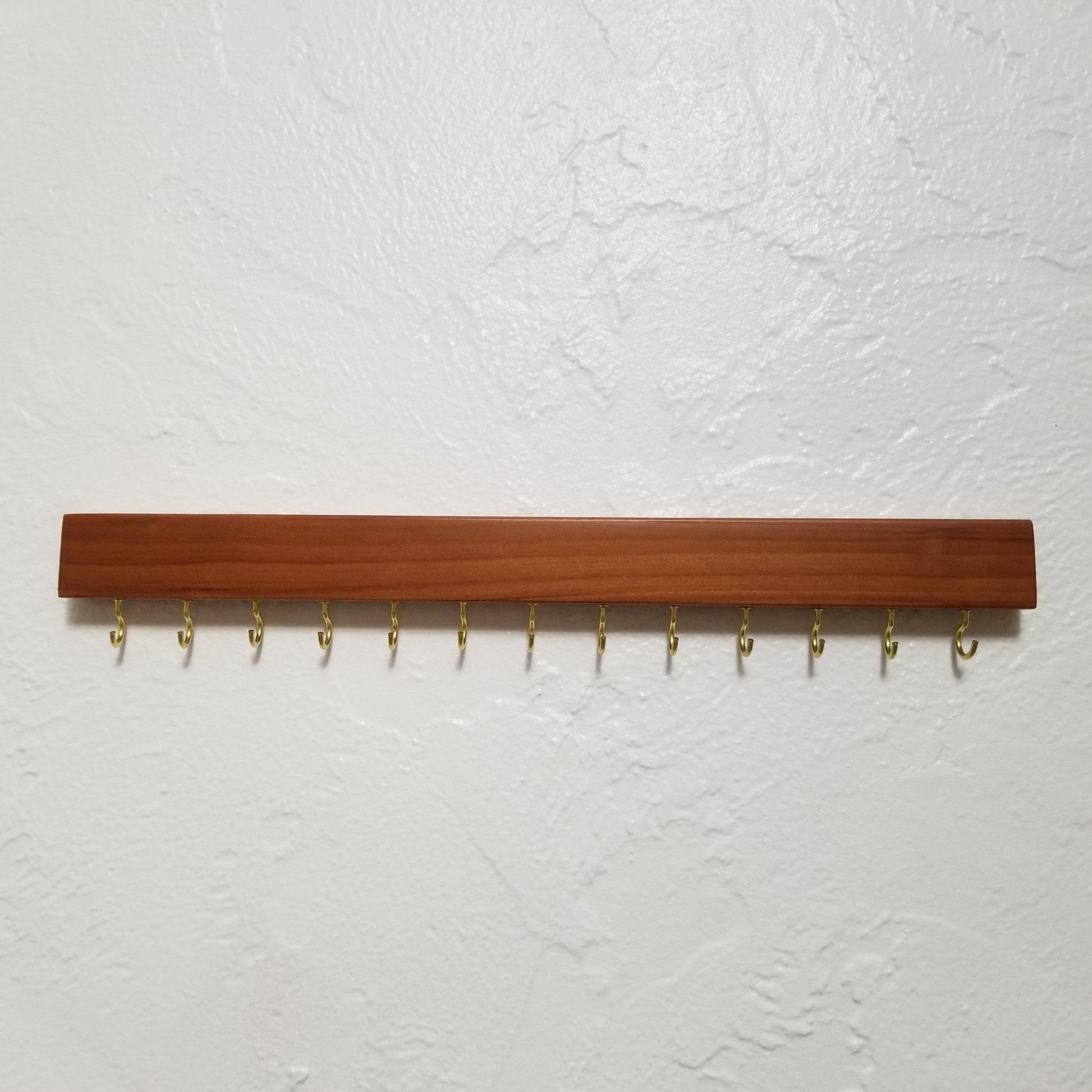 Our Entryway hangers are great for keys, sunglasses, jewelry, hair ties, and anything else you might like to keep handy at the front door. These redwood key racks come with 13 Brass Colored Hooks spaced about 1 inch apart making it a great holder for sunglasses, keys, and more. Our key holders are made out of salvaged California Redwood that would otherwise be disposed of. They are cut, sanded, and then finished with a clear finish to help bring out the grain and coloring of this unique, gorgeous wood.