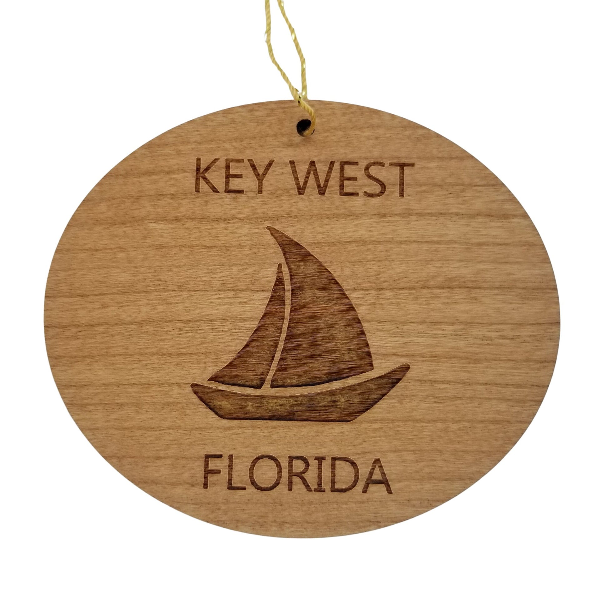 Key West Souvenir Ornament with a Sailboat and engraved with a Key West Florida namedrop. These wood laser cut handmade ornaments are made in our little father and daughter woodshop in northern California and make a great Key West souvenir or memento for anyone who has visited or is visiting Key West, FL.