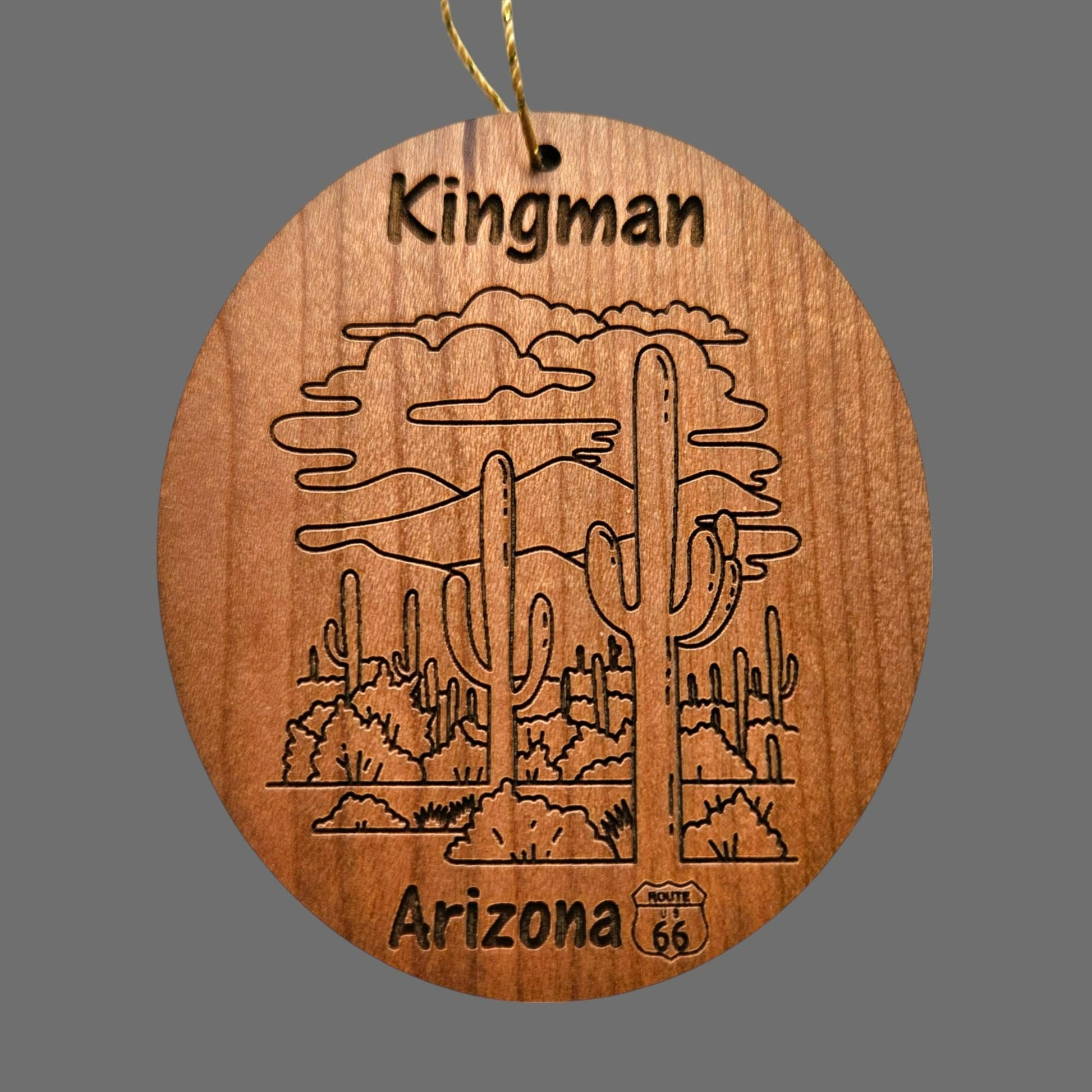 Kingman AZ Souvenir Ornament with a graphic that includes cactus or cacti, clouds, and desert like shrubs and engraved with a Kingman Arizona namedrop. These wood laser cut handmade ornaments are made in our little father and daughter woodshop in northern CA and make a great Arizona souvenir or memento.