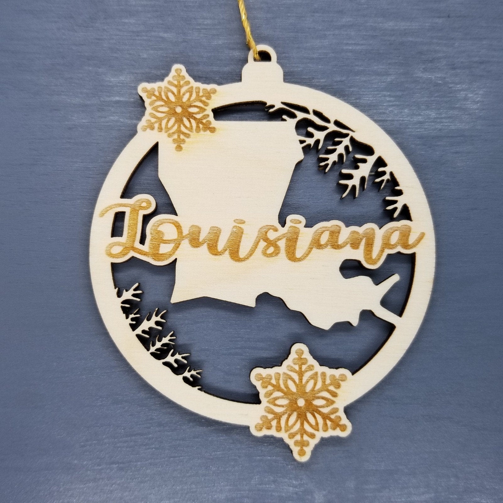 This Louisiana State Ornament is handmade from wood. The cutout and engraved design depicts a the state shape of LA, branches, and snowflakes.