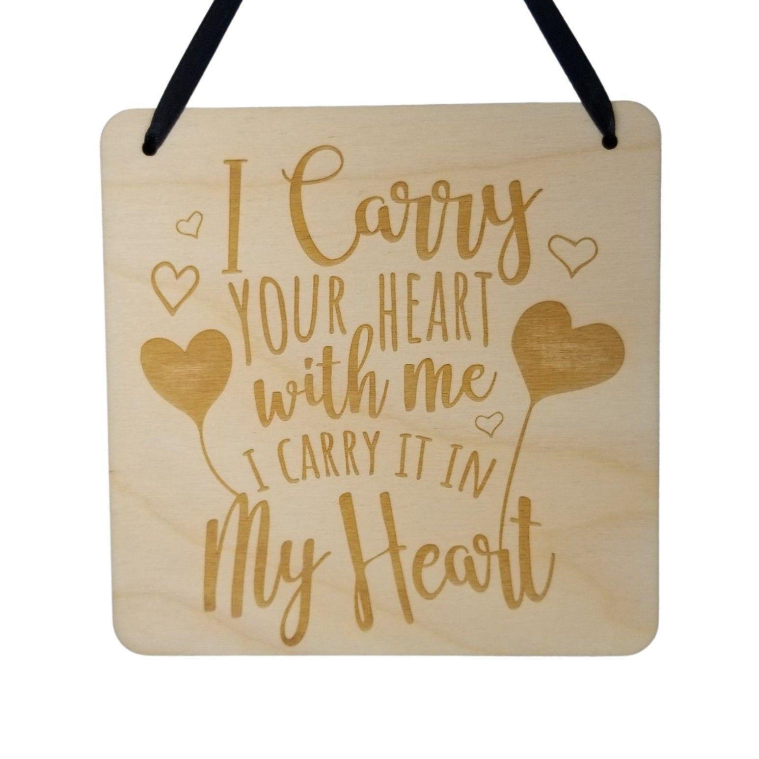This cute rustic natural wood sign that says I Carry Your Heart With Me I Carry It In My Heart is the perfect sign for any for a valentine's day gift, wedding gift, or anniversary gift. Also, makes a great wedding decoration. Whether in the house, office, or anywhere else you can think of these engraved wood signs will compliment any style.