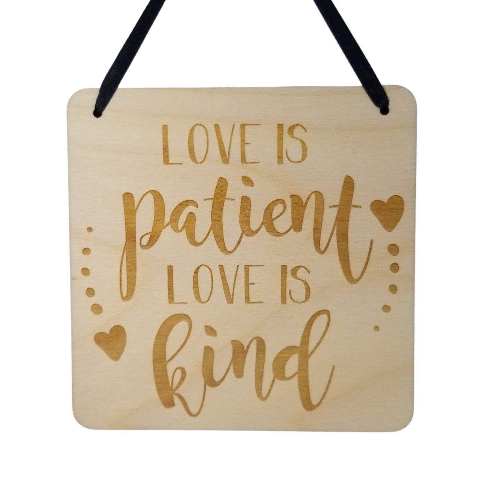 This cute rustic natural wood sign that says Love Is Patient Love Is Kind is the perfect sign for any for a valentine's day gift, wedding gift, or anniversary gift. Also, makes a great wedding decoration. Also great as a Bible Study Group gift or the person who loves this Bible Verse. Whether in the house, office, or anywhere else you can think of these engraved wood signs will compliment any style.
