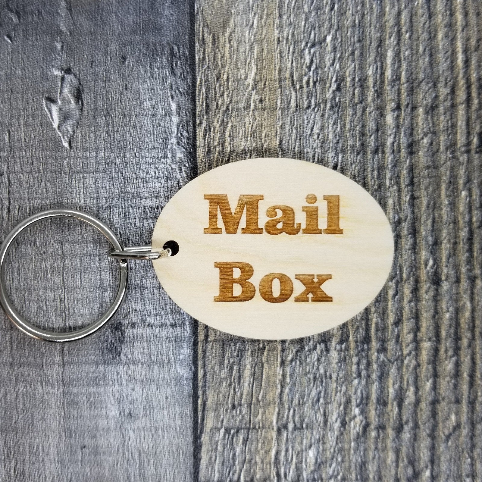 Mail Box Keyring or Keychain perfect way to mark the Mail Box key for businesses, households, rentals, etc. The Wood portion is approximately 2" long by 1.5" wide and 1/8" thick. Wood grain and coloring can vary quite a bit as can the darkness of the engrave. The single keychain photo is a good representation of what you will receive but is not a picture of the "exact" keychain that will be sent. Grain may be going a different direction, may have marks, knots, and coloring maybe different.