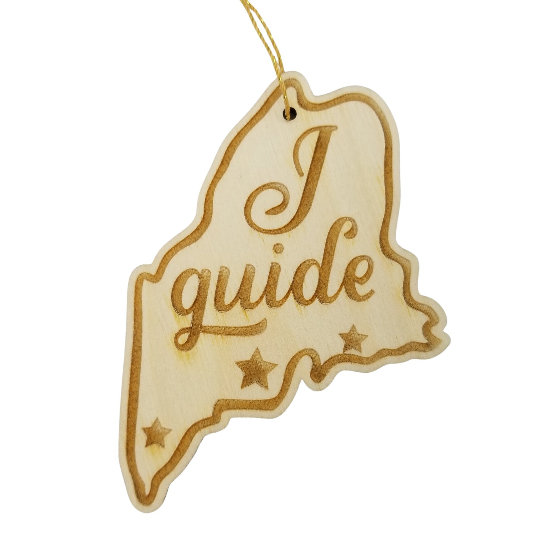 This Maine Ornament is handmade from wood. The cutout and engraved design depicts the state shape of ME with the State Motto - I Guide.