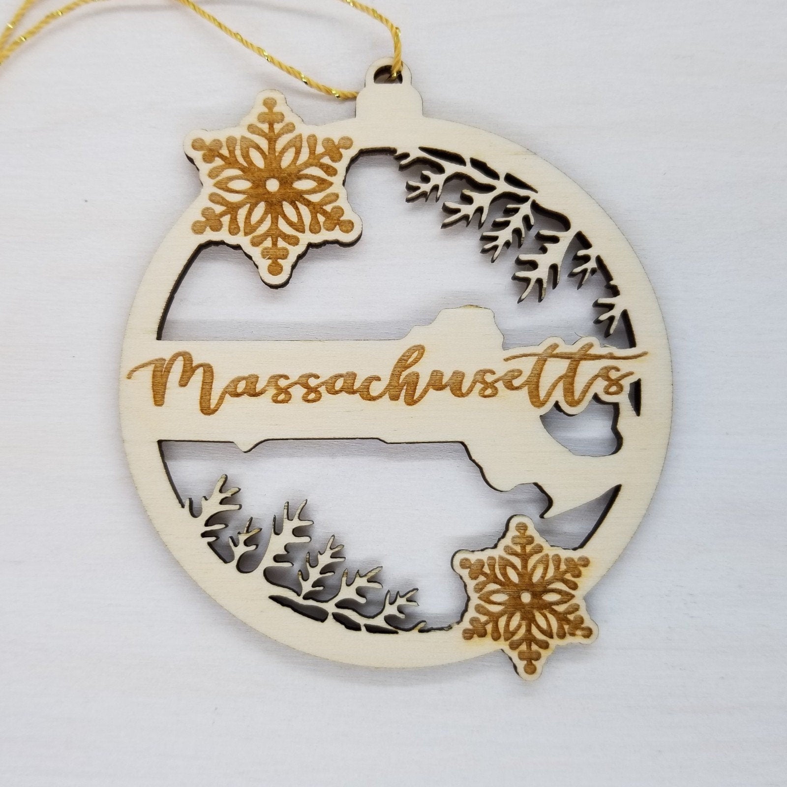 This Massachusetts Ornament is handmade from wood. The cutout and engraved design depicts a the state shape of MA, branches, and snowflakes.
