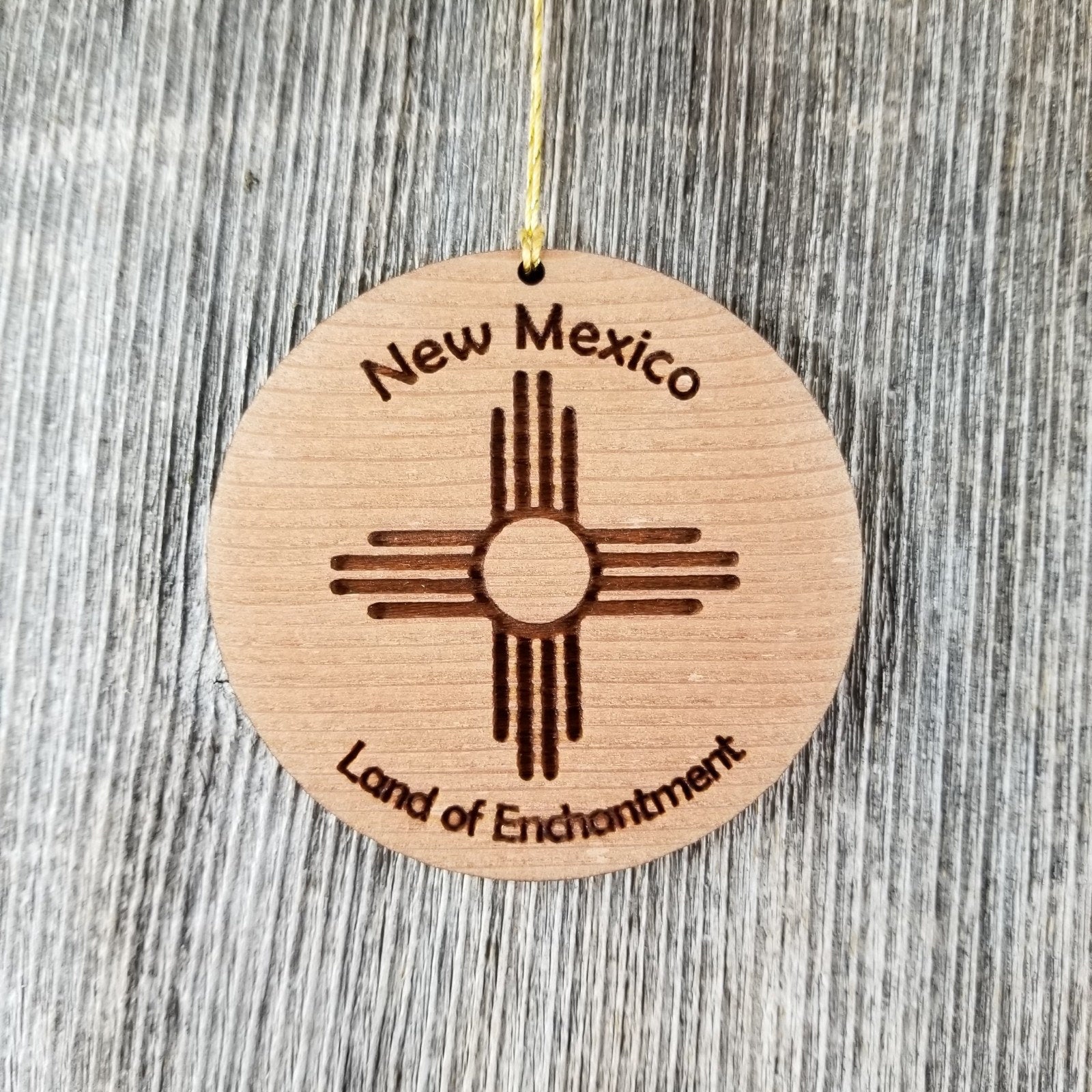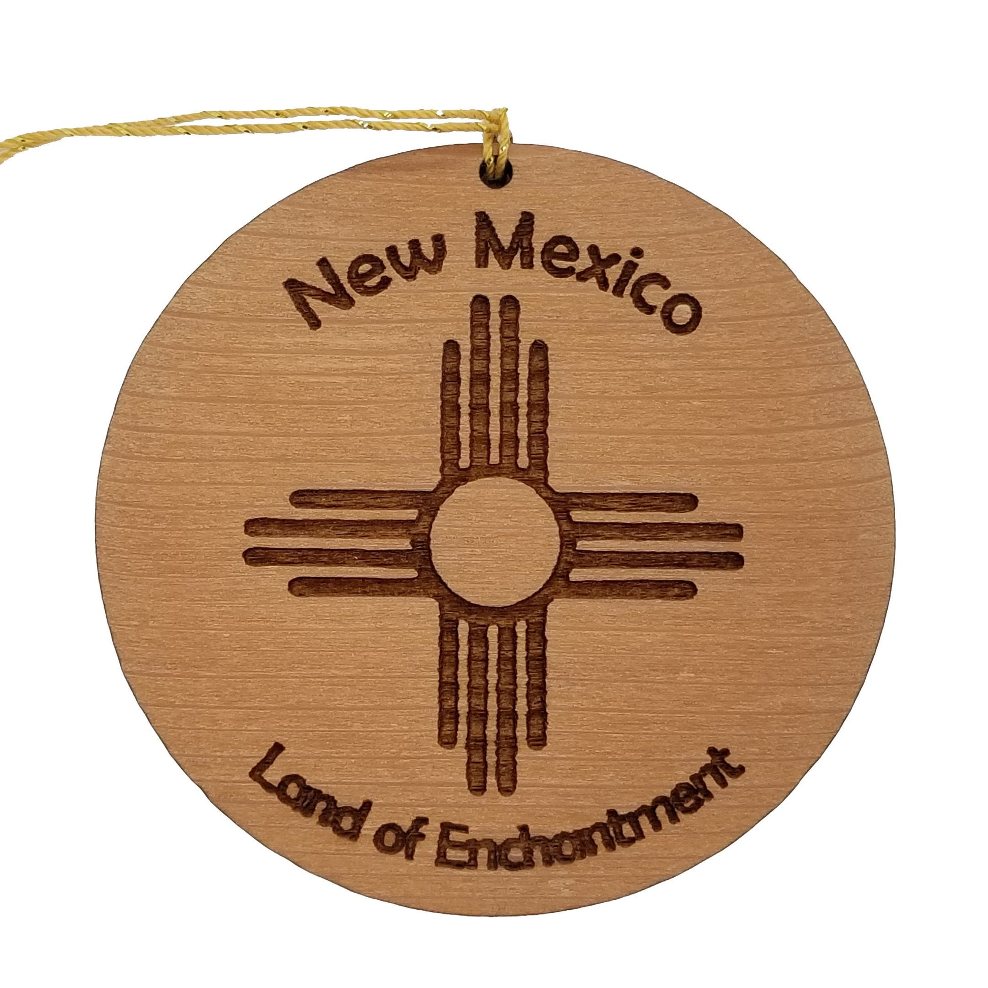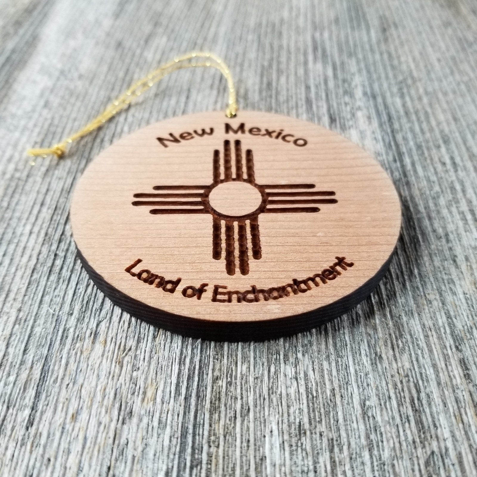 This New Mexico wood Christmas ornament is made out of wood and features the New Mexico Zia Flag Symbol. Engraved with New Mexico Land of Enchantment.