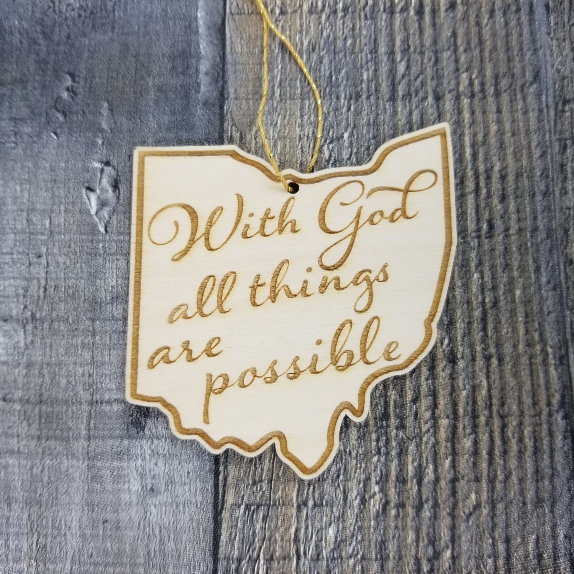 This Ohio Ornament is handmade from wood. The cutout and engraved design depicts the state shape of OH with the Stat Motto - With God All Things Are Possible.