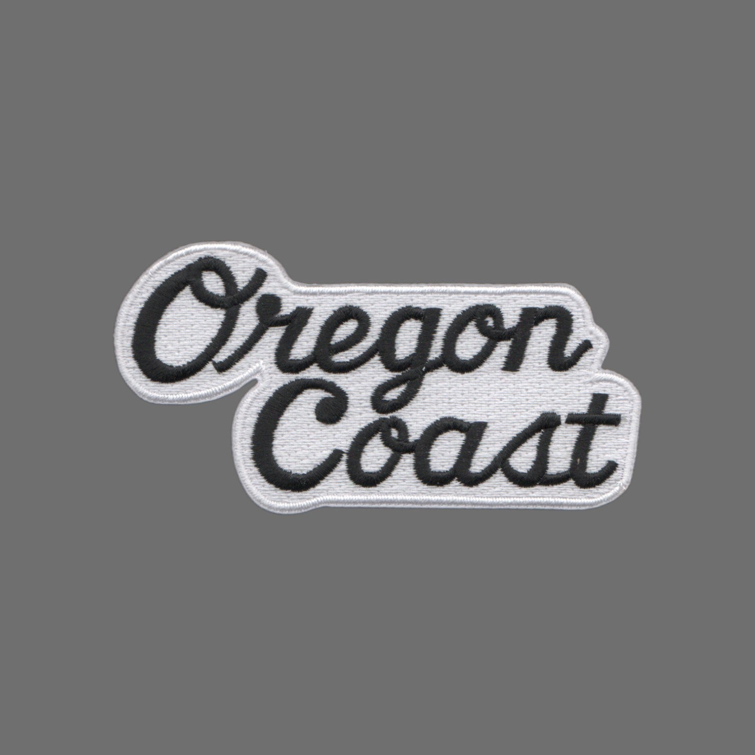 2850-01/39 - Oregon Script Text or Font Black Words on White Souvenir Patch, Badge, or Emblem.