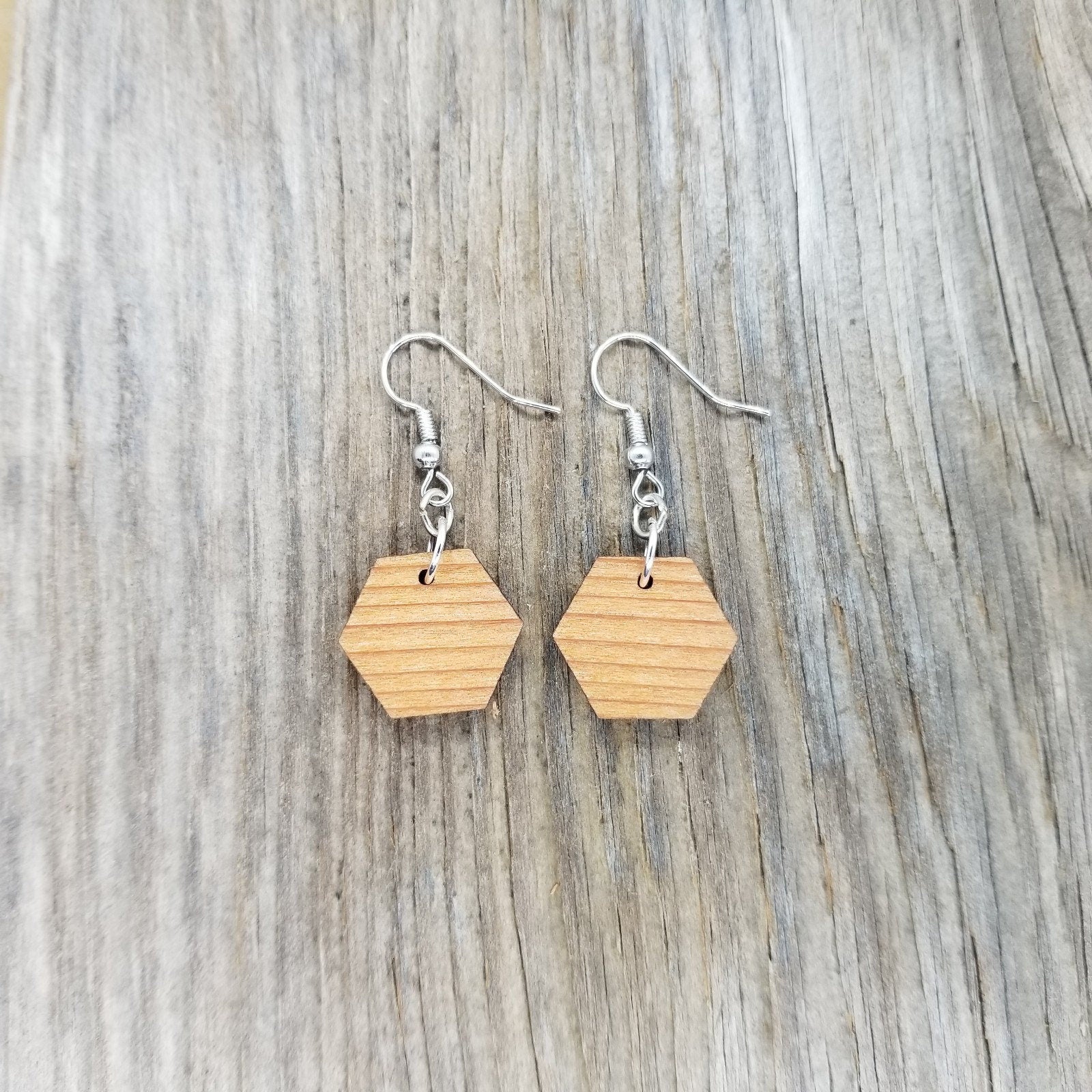 Hexagon Dangle Wood Earrings handcrafted from Genuine California Redwood in the USA in a small father and daughter wood shop in Northern California.