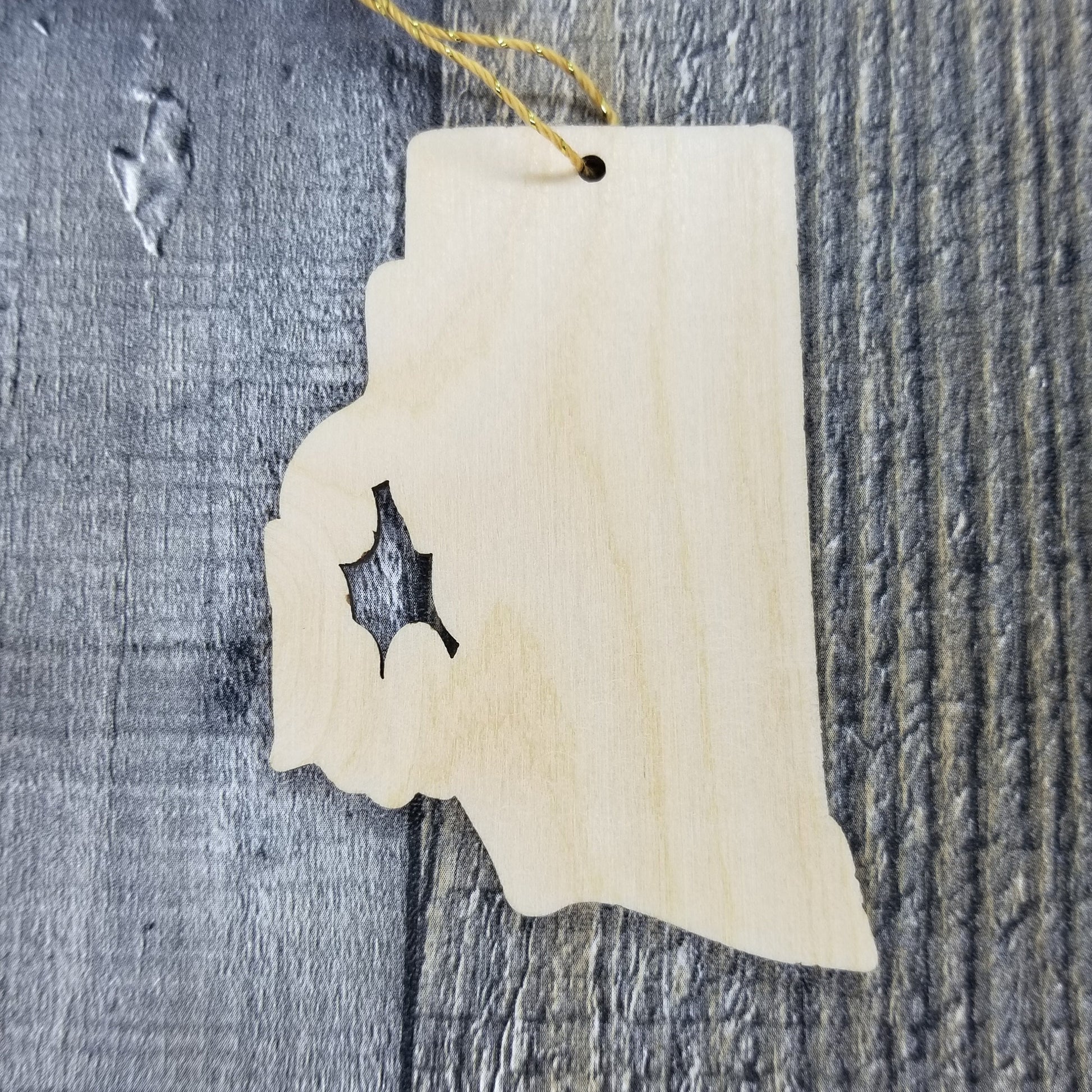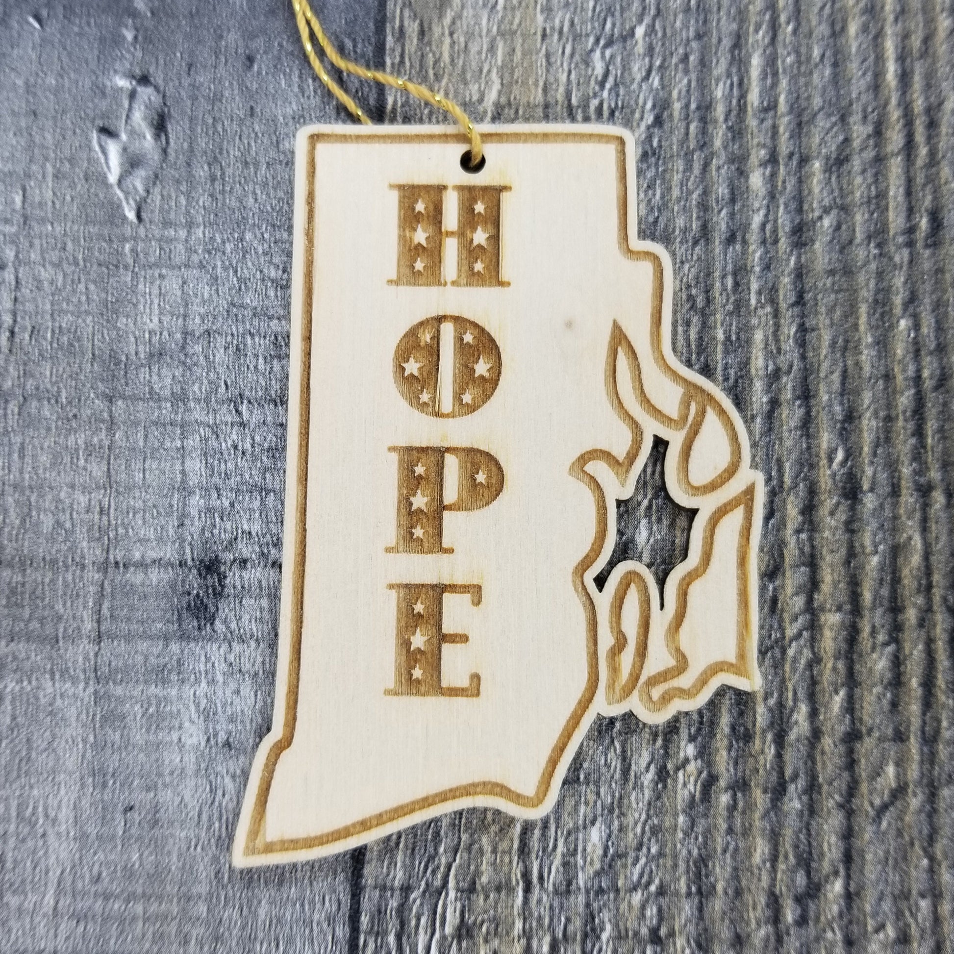 This Rhode Island Ornament is handmade from wood. The cutout and engraved design depicts a the state shape of RI with the state motto - HOPE