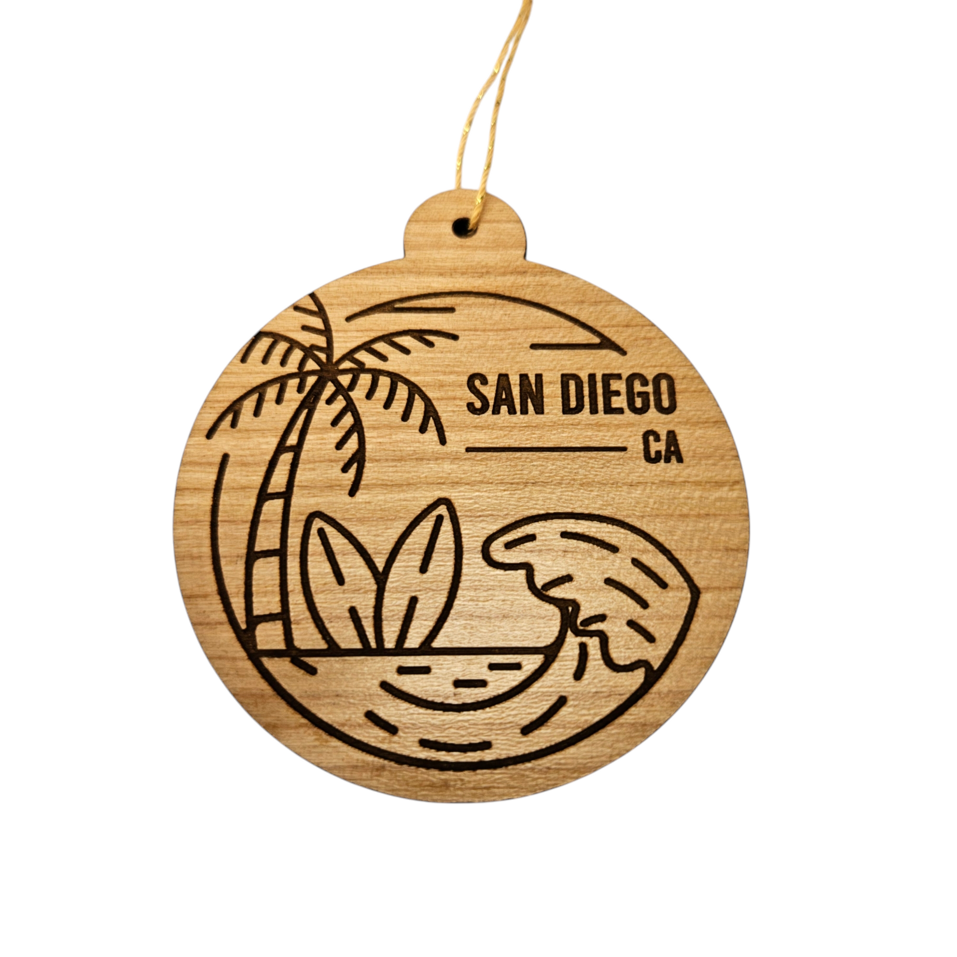 San Diego Souvenir Ornament with an Ocean Beach scene including a Palm Tree, Surfboards, and waves and engraved with a San Diego CA namedrop. These wood laser cut handmade Ocean Beach ornaments are made in our little father and daughter woodshop and makes a great San Diego CA souvenir or memento.