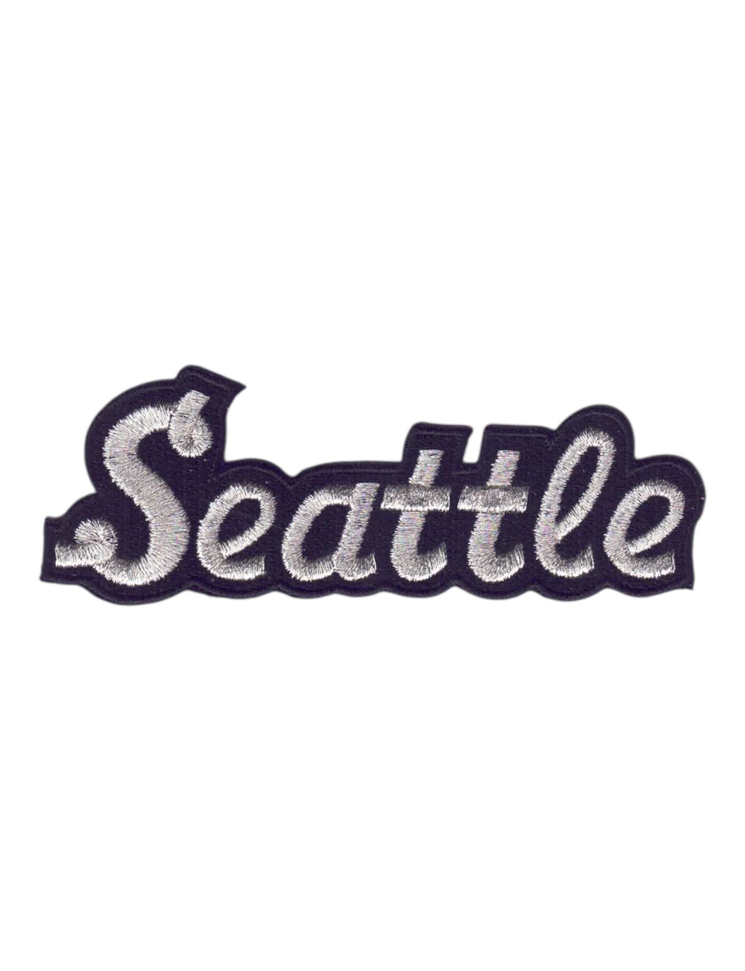 3396-58M/01 - Seattle script text or font Silver Words on Black Souvenir Patch, Badge, or Emblem.