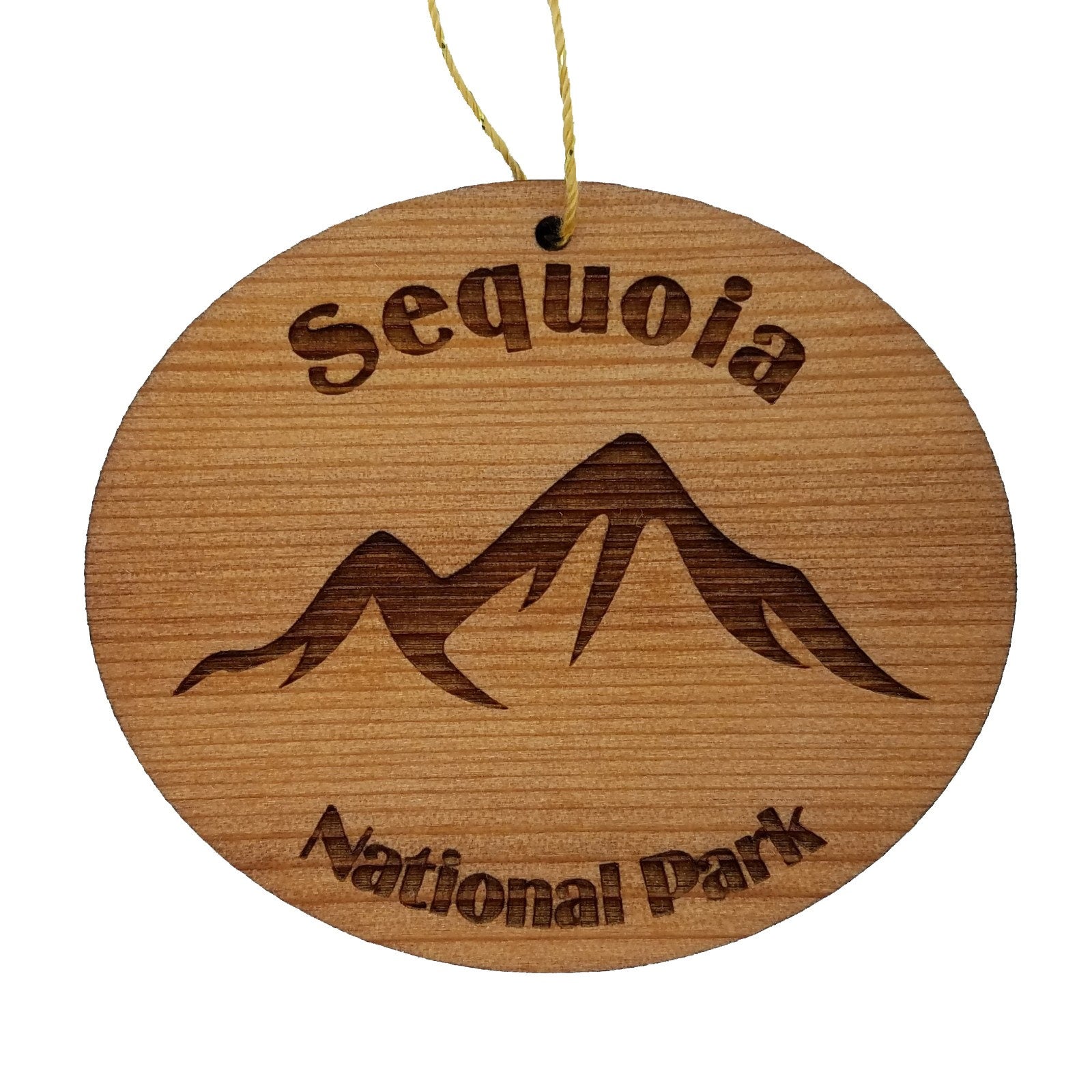 Sequoia Souvenir Ornament with Mountains and engraved with a Sequoia National Park namedrop. These wood laser cut handmade ornaments are made in our little father and daughter woodshop in northern California and make a great Sequoia National Park souvenir or memento in California.