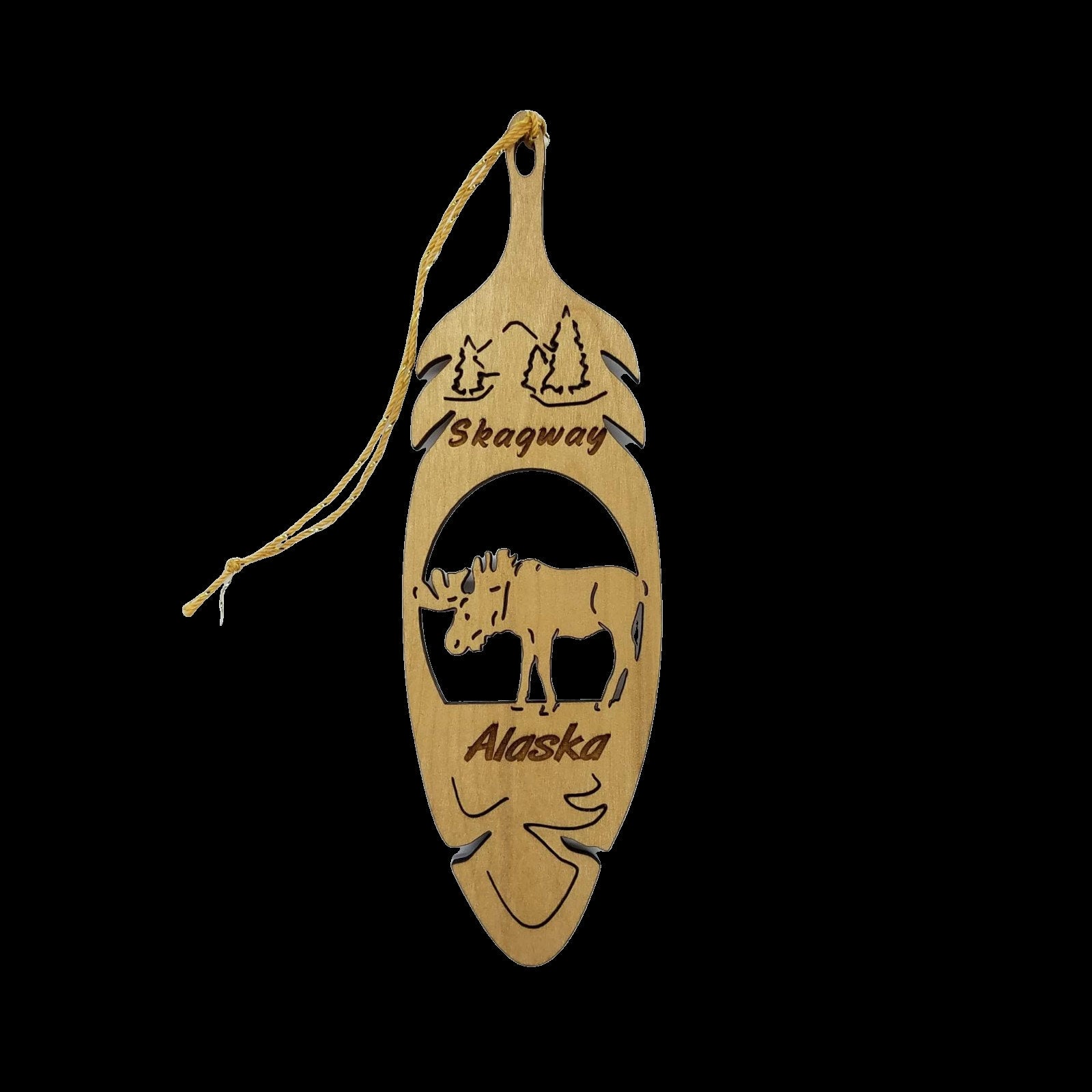Moose AK State Christmas ornament is made out of wood, is laser cut and engraved and is namedropped with the words Skagway Alaska. Depicts a moose and trees cutout inside of a leaf shape.