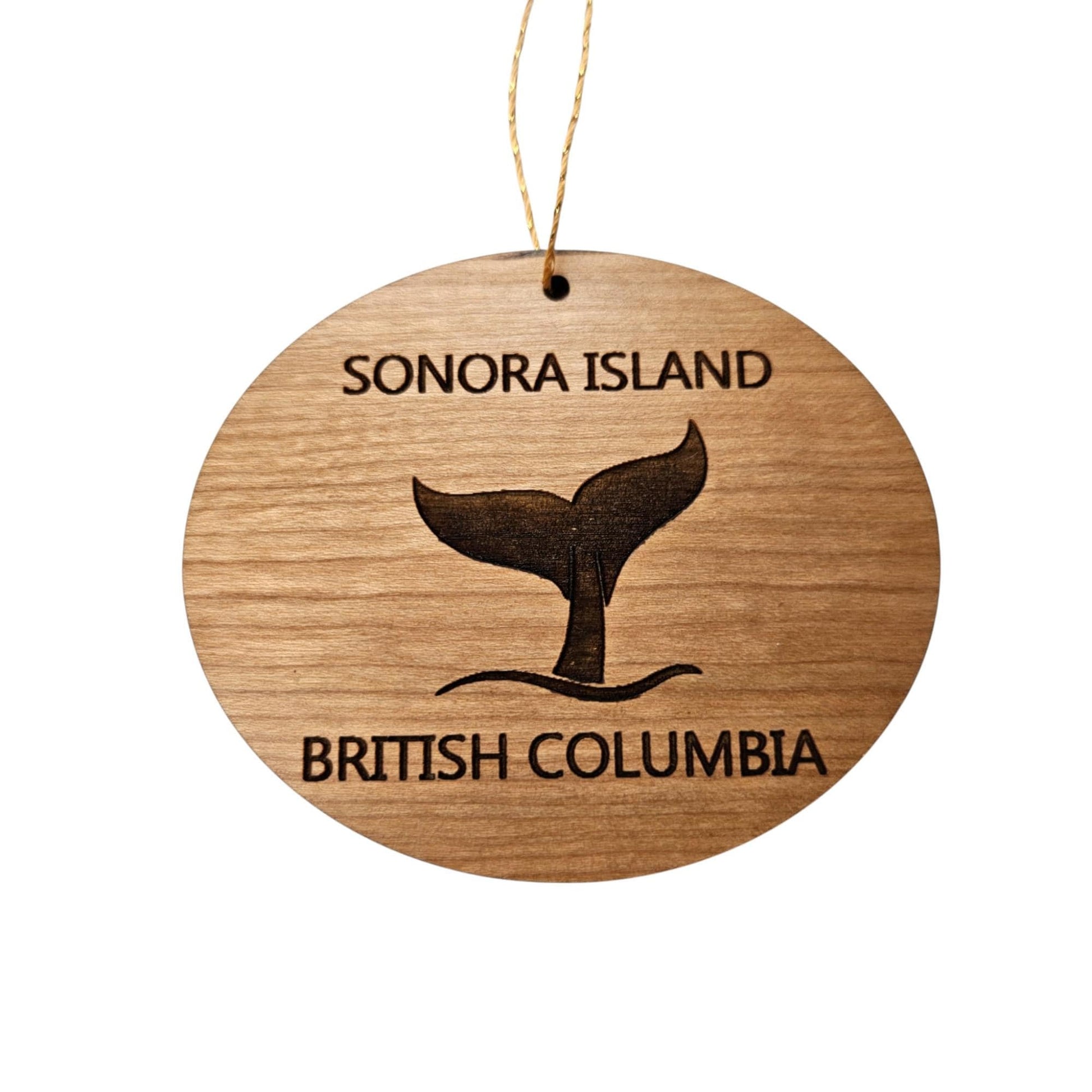 Sonora Island Souvenir Ornament with a Whale Tail and engraved with a Sonora Island British Columbia namedrop. These wood laser cut handmade ornaments are made in our little father and daughter woodshop in northern California and make a great Vancouver Island memento or souvenir for anyone who has visited or is visiting Vancouver Island Canada.