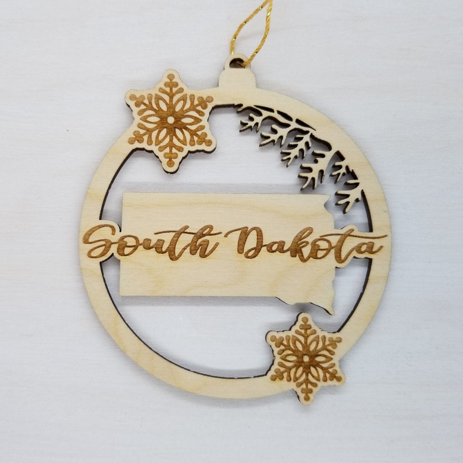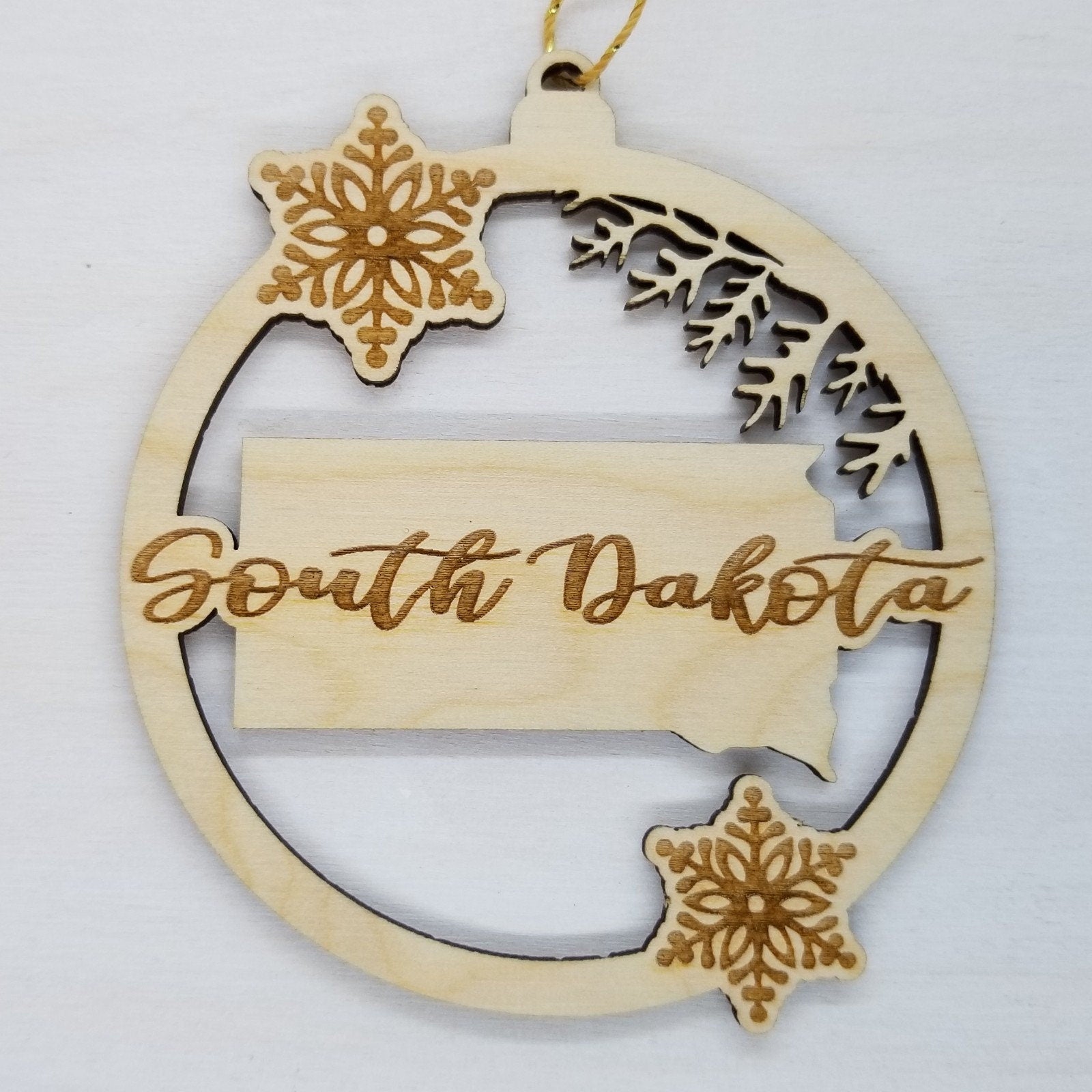 This South Dakota State Ornament is handmade from wood. The cutout and engraved design depicts a the state shape of SD, branches, and snowflakes.