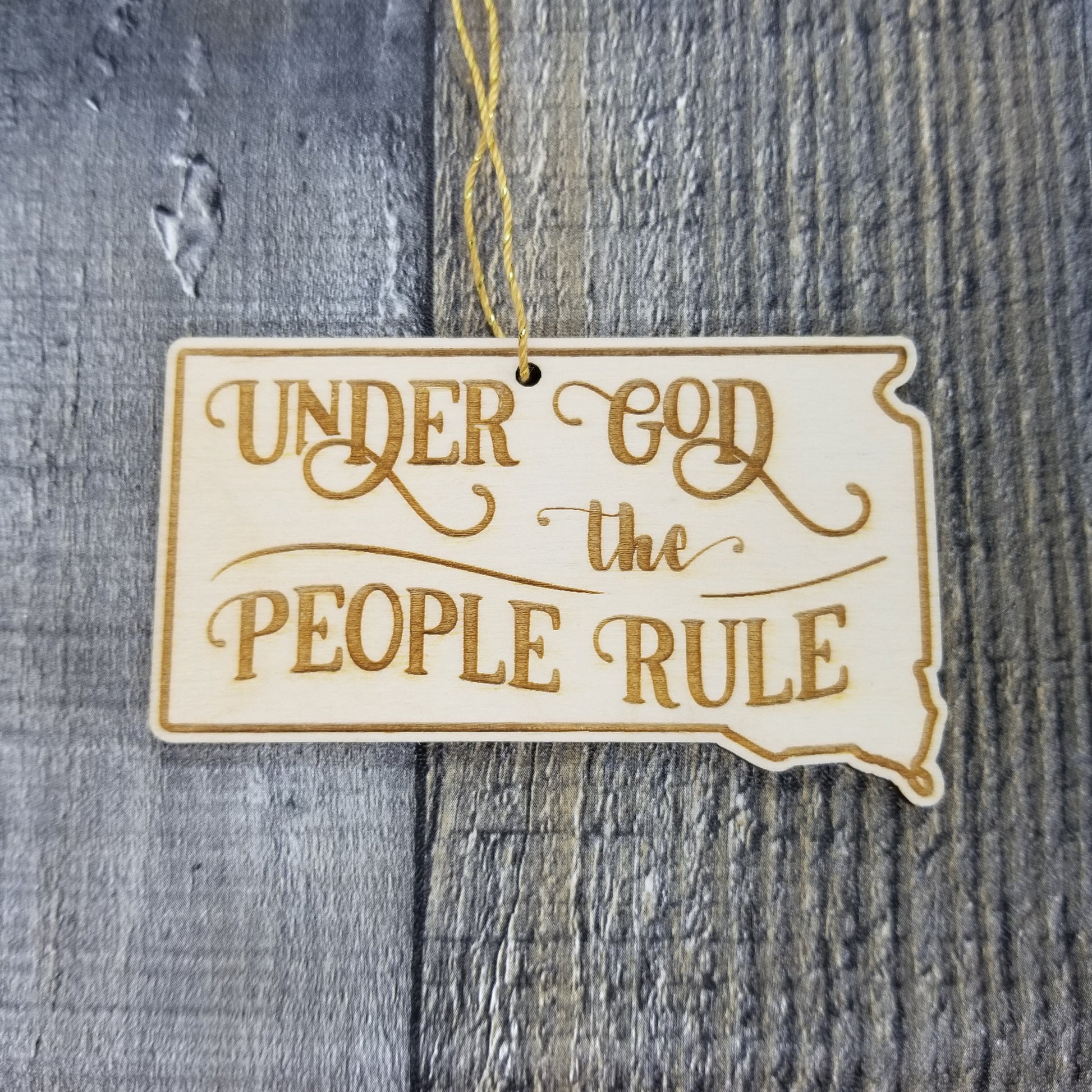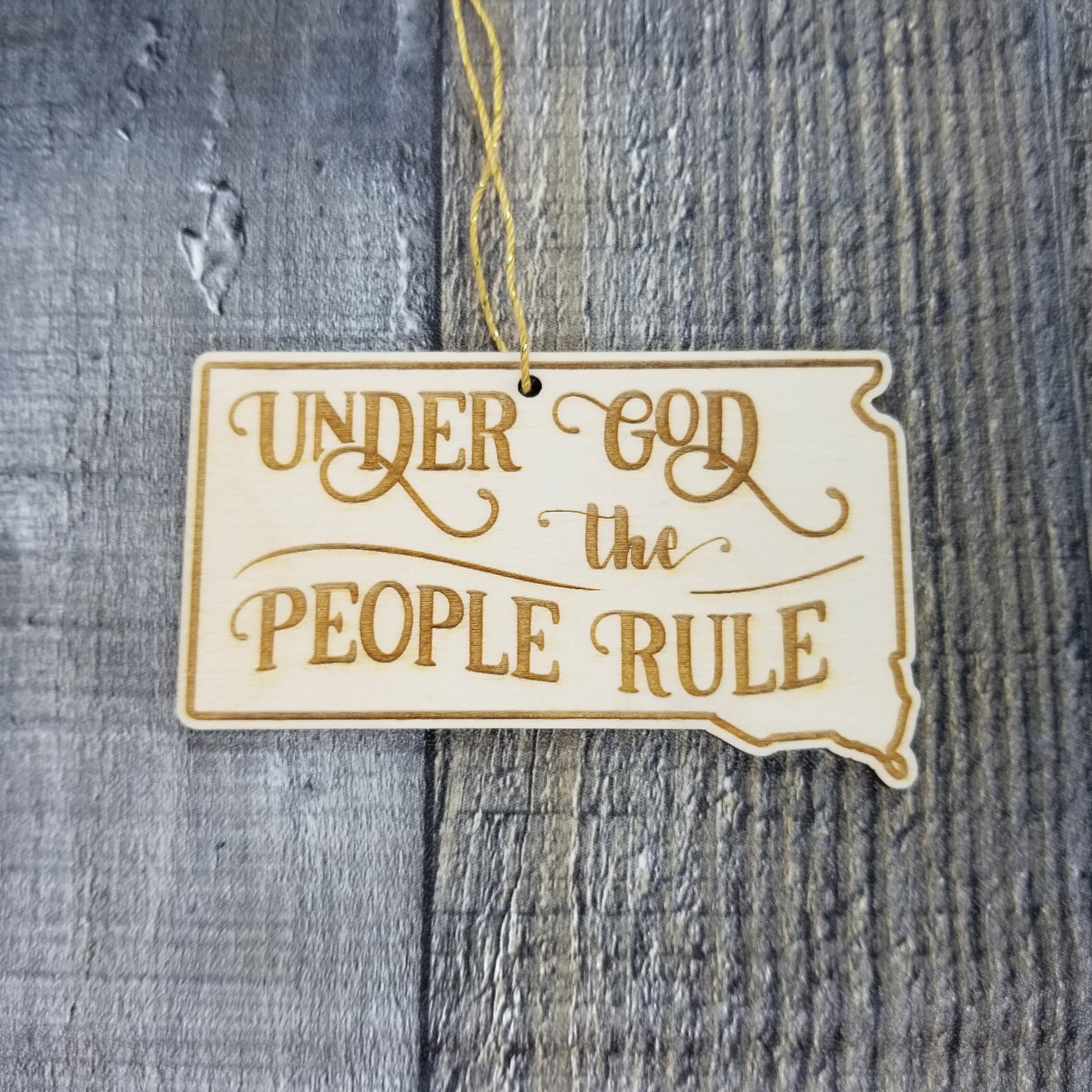 This South Dakota Ornament is handmade from wood. The cutout and engraved design depicts the state shape of SD and the State Motto - Under God The People Rule