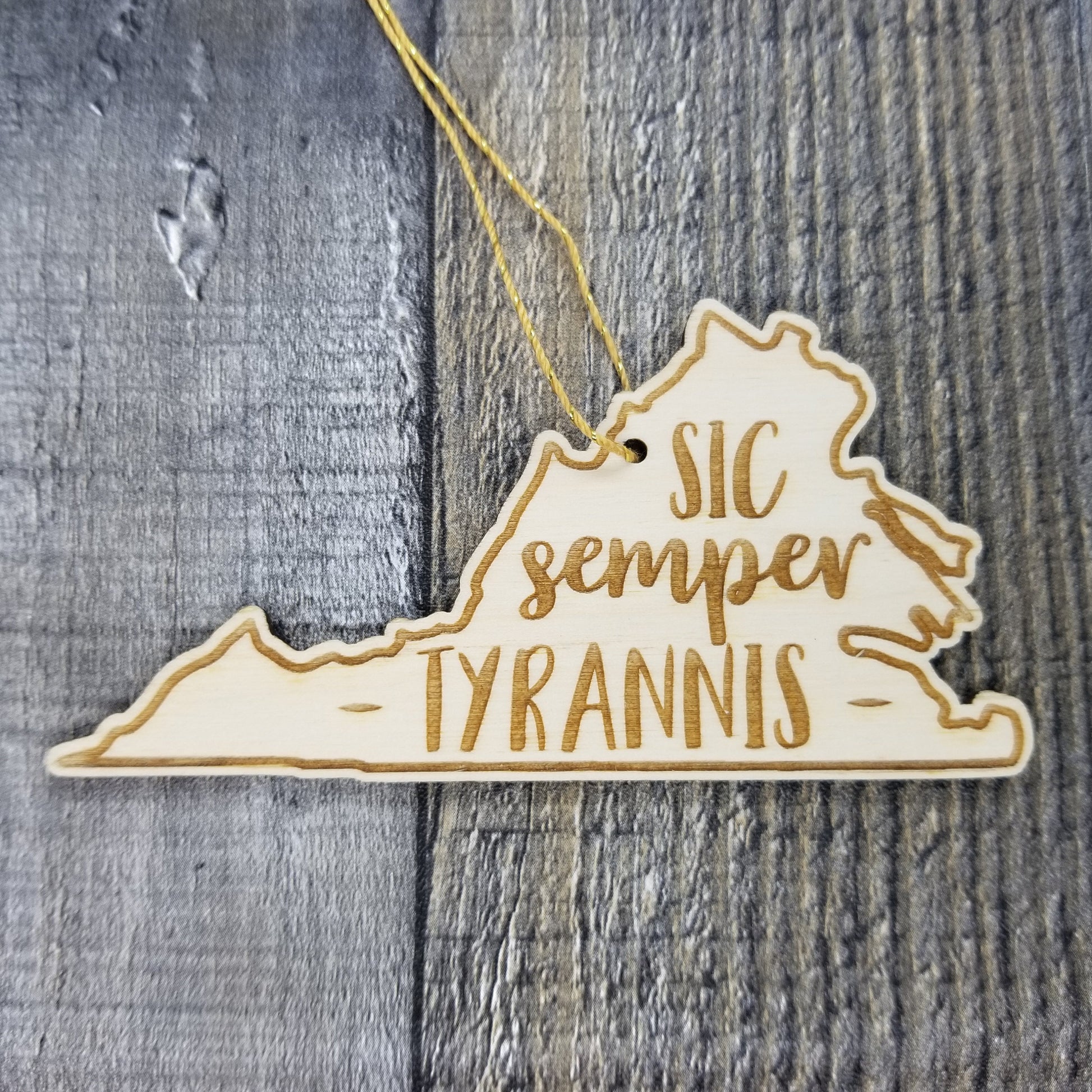 This Virginia Ornament is handmade from wood. The cutout and engraved design depicts a the state shape of VA and the State Motto - SIC Semper Tyrannis