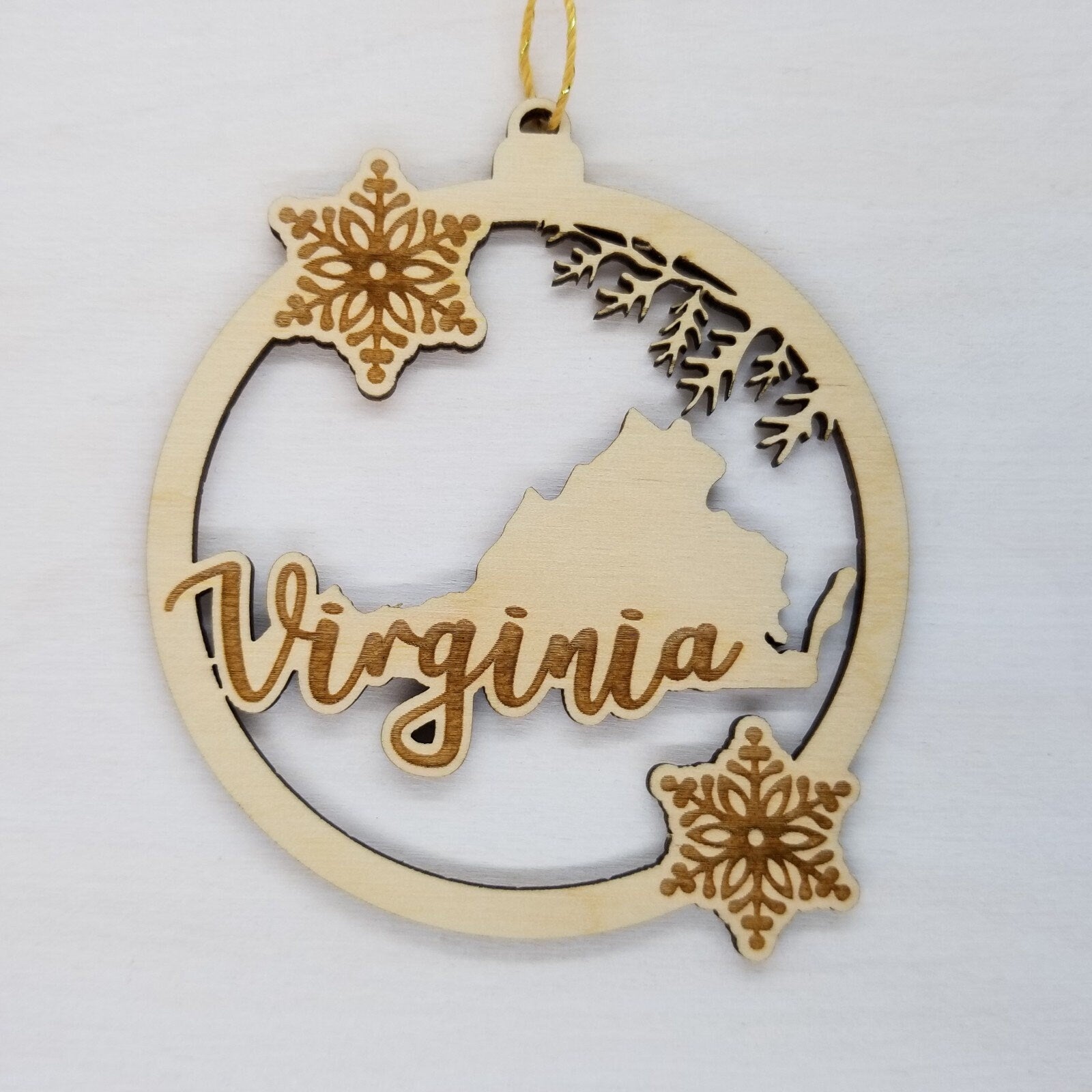 This Virginia State Ornament is handmade from wood. The cutout and engraved design depicts a the state shape of VA, branches, and snowflakes.