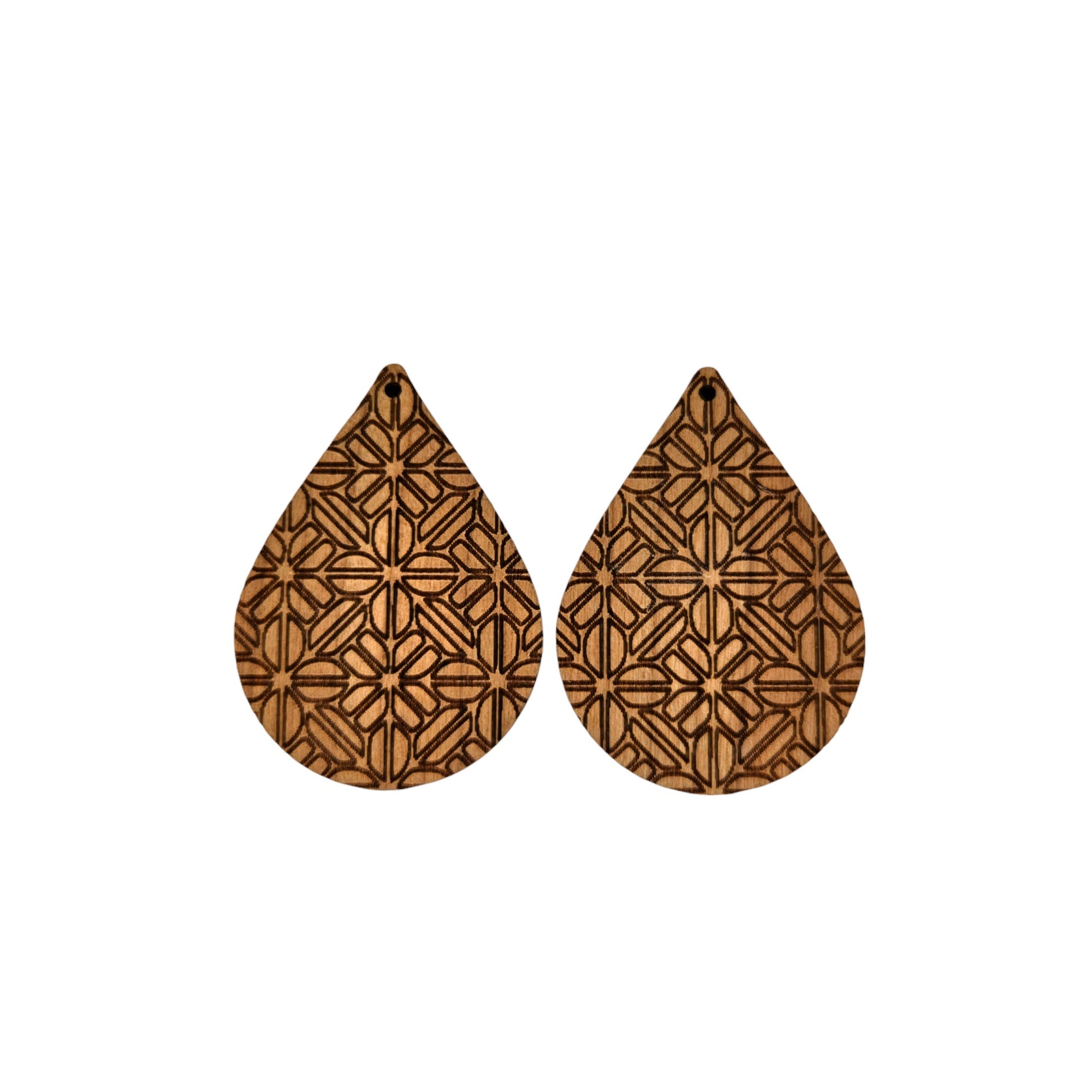 Wood earrings in a teardrop shape engraved with an abstract type of floral pattern handcrafted in the USA in a small father and daughter wood shop in Northern California.