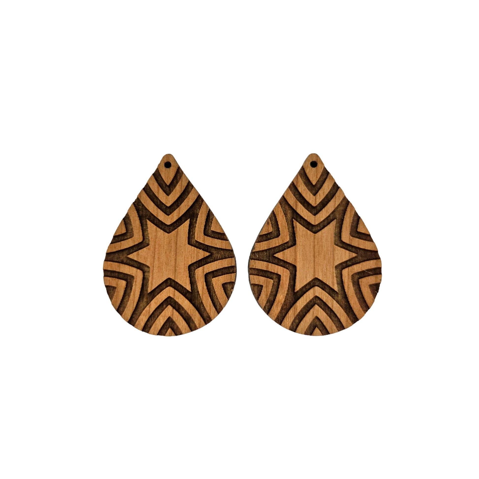 Wood earrings in a teardrop shape engraved with a Star Ray pattern handcrafted in the USA in a small father and daughter wood shop in Northern California.